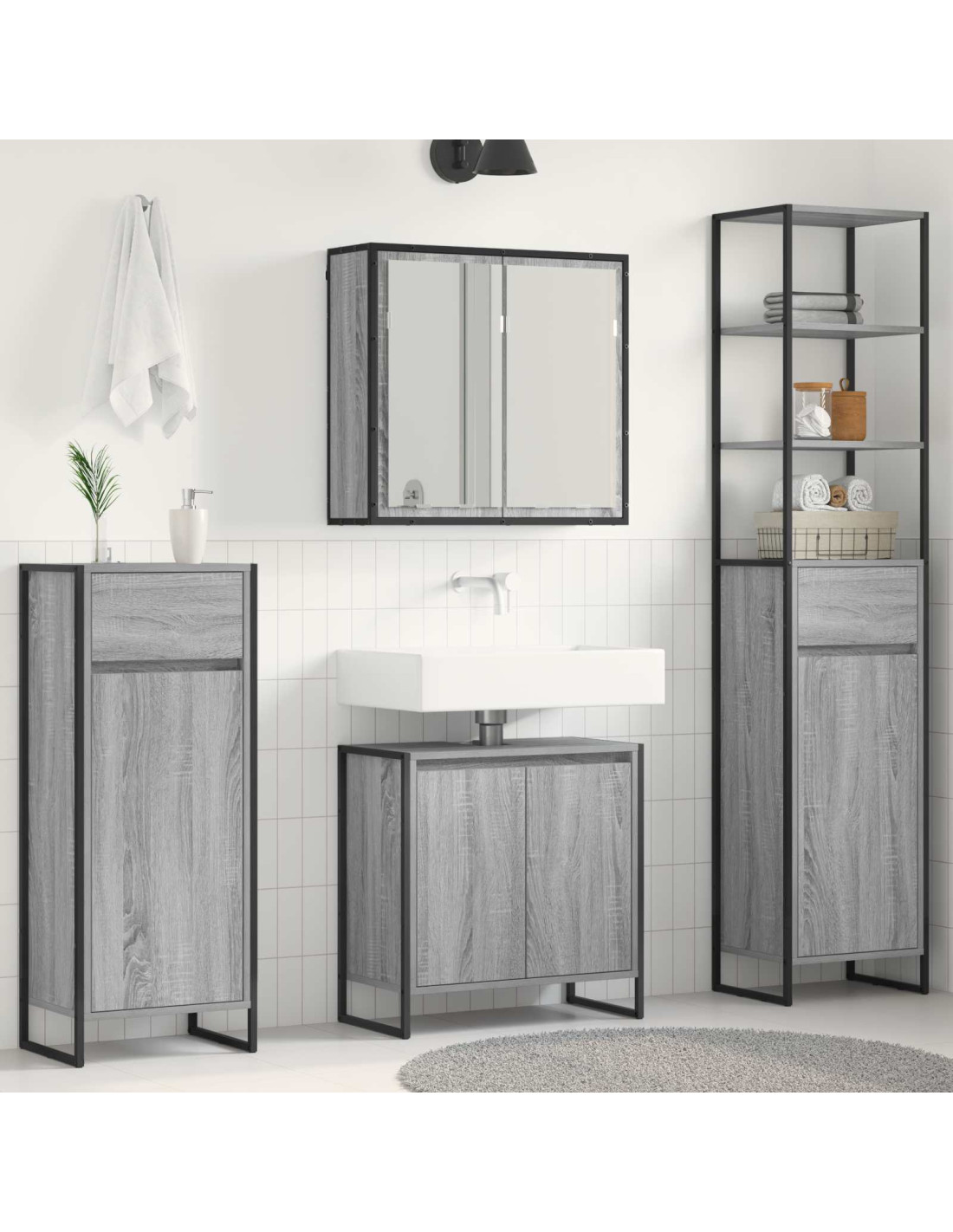 Questo set di mobili da bagno rappresenta davvero l'eleganza moderna, unendo con stile funzionalità e bellezza. È perfetto per spazi abitativi in città e offre soluzioni di stoccaggio efficaci, soddisfacendo le esigenze attuali con un design fluido e un aspetto raffinato. La combinazione di legno ingegnerizzato e acciaio rende il set resistente e pratico, adatto per un bagno alla moda.