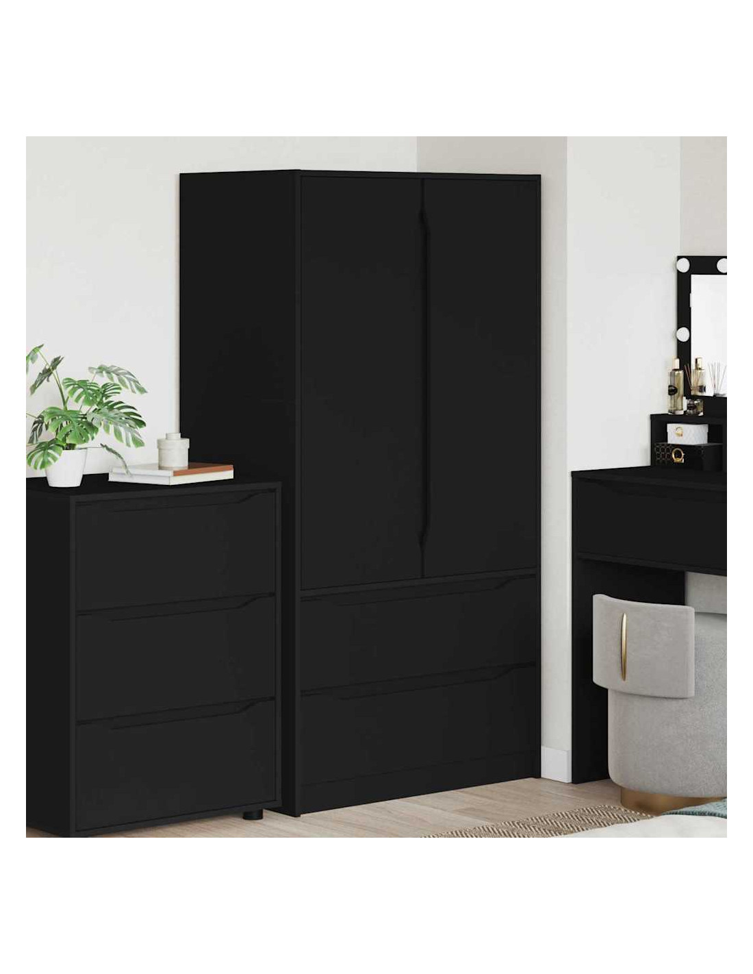 - Materiali L'armadio è fatto di legno ingegnerizzato di alta qualità, che è traspirante e molto resistente anche in ambienti umidi. La superficie liscia del legno gli dà un aspetto bello e resiste all'usura.
