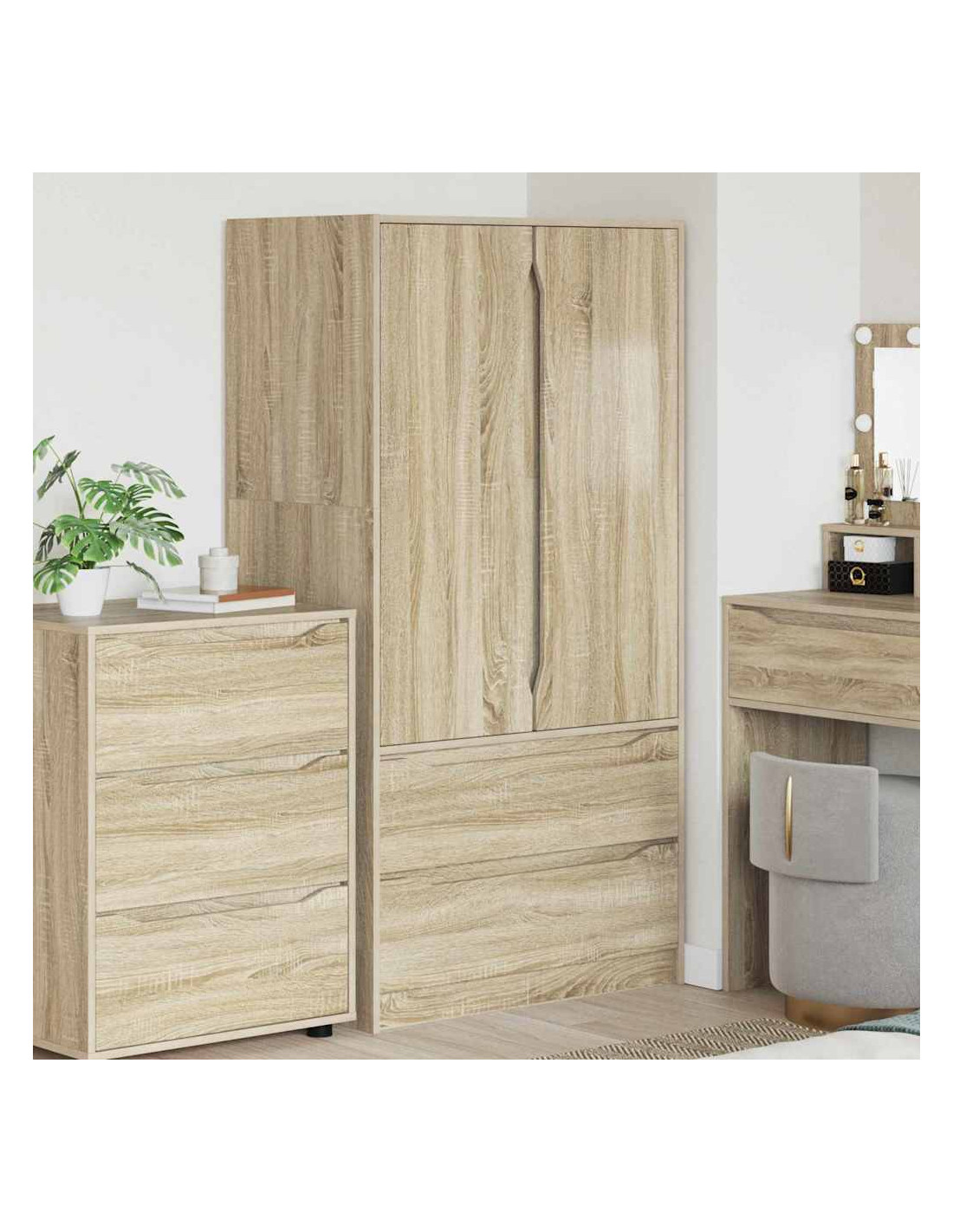 - Materiali L'armadio è fatto di legno ingegnerizzato di alta qualità, che è traspirante e molto resistente anche in ambienti umidi. La superficie liscia del legno gli dà un aspetto bello e resiste all'usura.