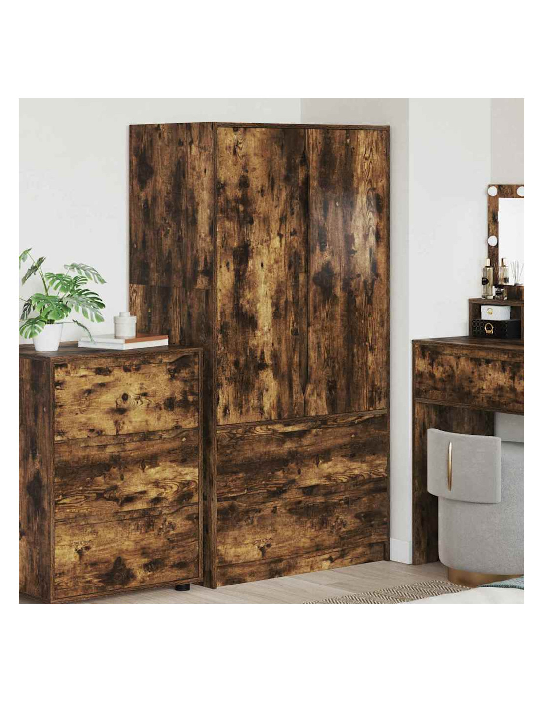 - Materiali L'armadio è fatto di legno ingegnerizzato di alta qualità, che è traspirante e molto resistente anche in ambienti umidi. La superficie liscia del legno gli dà un aspetto bello e resiste all'usura.