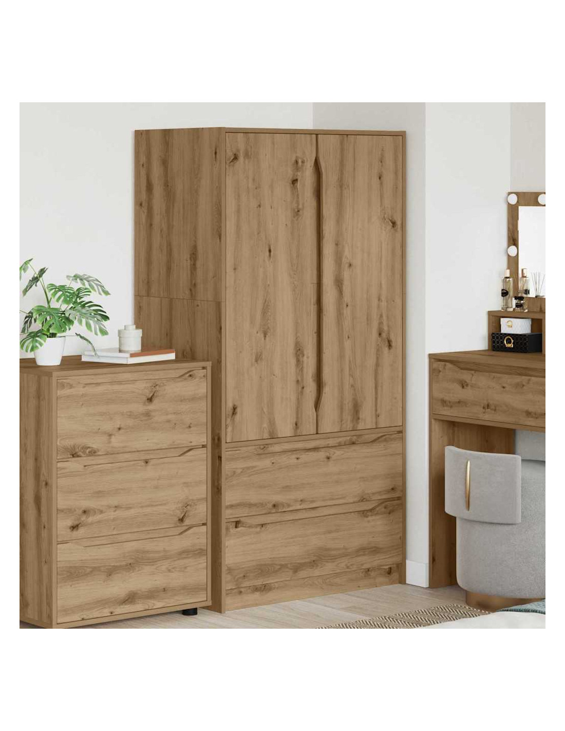 - Materiali L'armadio è fatto di legno ingegnerizzato di alta qualità, che è traspirante e molto resistente anche in ambienti umidi. La superficie liscia del legno gli dà un aspetto bello e resiste all'usura.