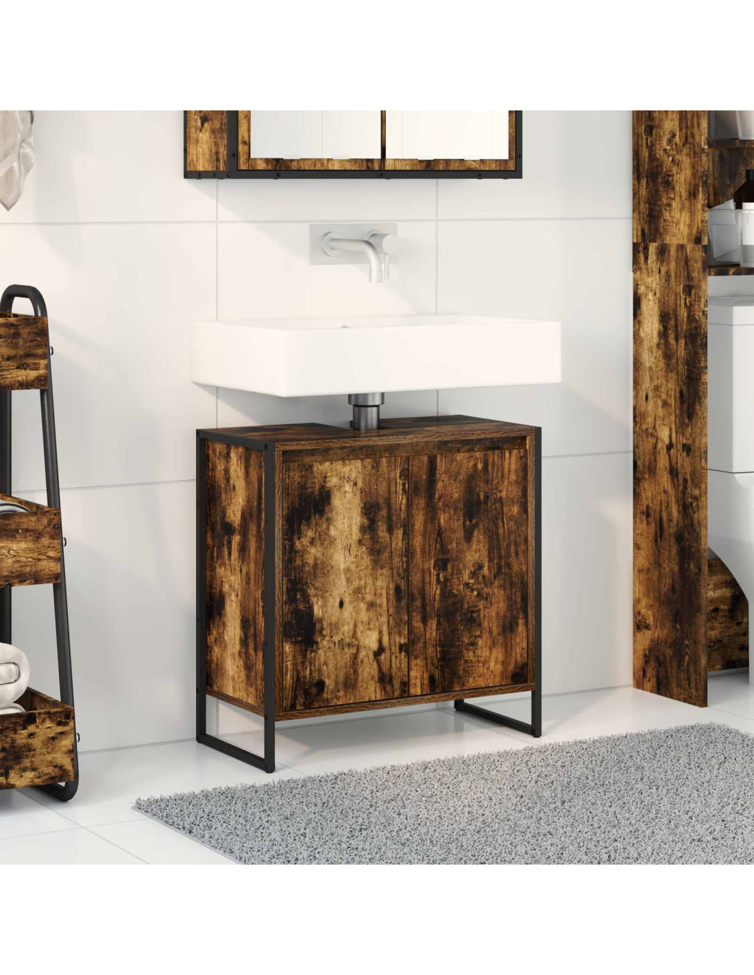 Questo mobile da bagno industriale in legno ingegnerizzato è perfetto per chi cerca un'alternativa di stoccaggio bella e pratica. Grazie alla sua forma rettangolare elegante, si integra bene in bagni moderni e industriali, offrendo tanto spazio per organizzare articoli da toeletta, asciugamani e altro.