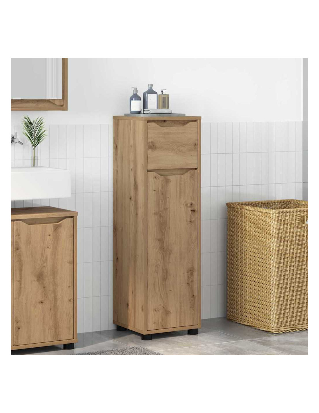 - Vantaggi del materiale: Costruito in legno ingegnerizzato, questo mobile ha proprietà traspiranti, ideali per bagni umidi. Duraturo, è un pezzo d'arredo che resiste all'uso quotidiano rimanendo bello.