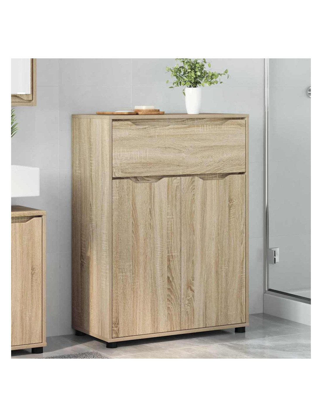 - Legno ingegnerizzato di qualità: L'armadietto è fatto con legno ingegnerizzato premium che ha una finitura liscia e si adatta a uno stile moderno. Questo materiale è resistente all'umidità, perfetto per il bagno. Inoltre, è molto durevole e mantiene il suo aspetto fresco nel tempo.