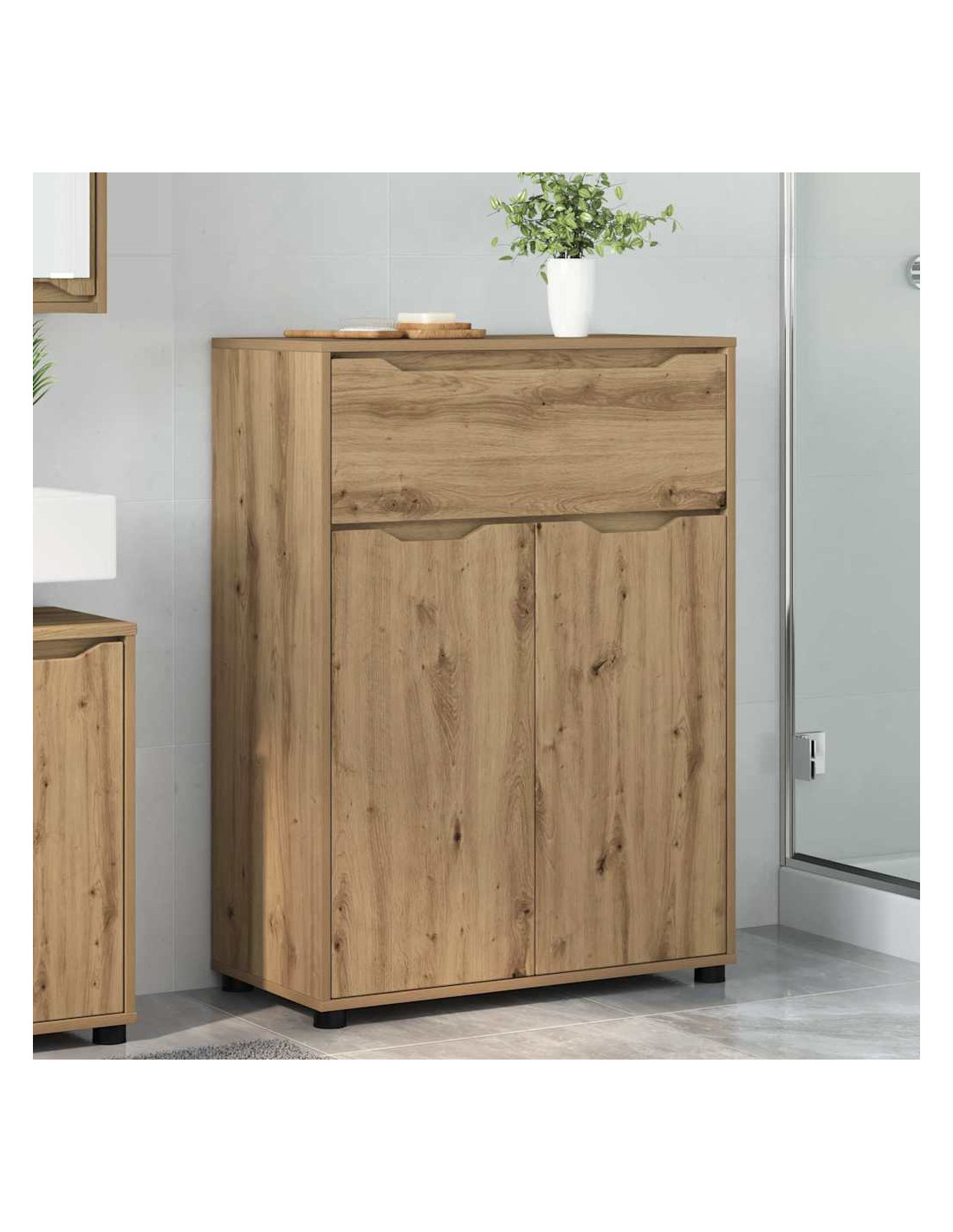 - Legno ingegnerizzato di qualità: L'armadietto è fatto con legno ingegnerizzato premium che ha una finitura liscia e si adatta a uno stile moderno. Questo materiale è resistente all'umidità, perfetto per il bagno. Inoltre, è molto durevole e mantiene il suo aspetto fresco nel tempo.