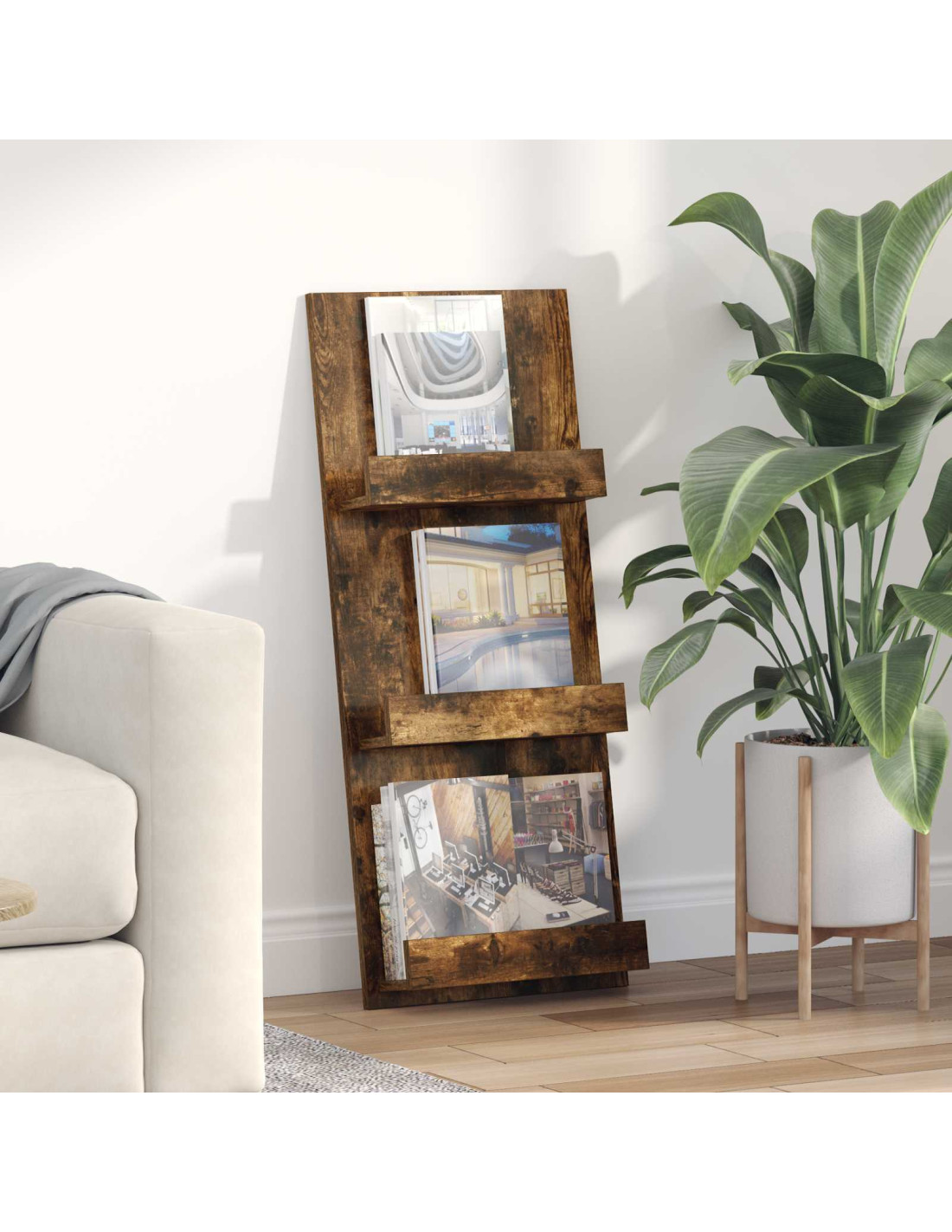 - Costruzione in legno ingegnerizzato Questo porta riviste è fatto di legno ingegnerizzato, un materiale che combina durata e stile. Resistente all’uso quotidiano e con una finitura liscia, aggiunge un tocco di eleganza al tuo arredamento.