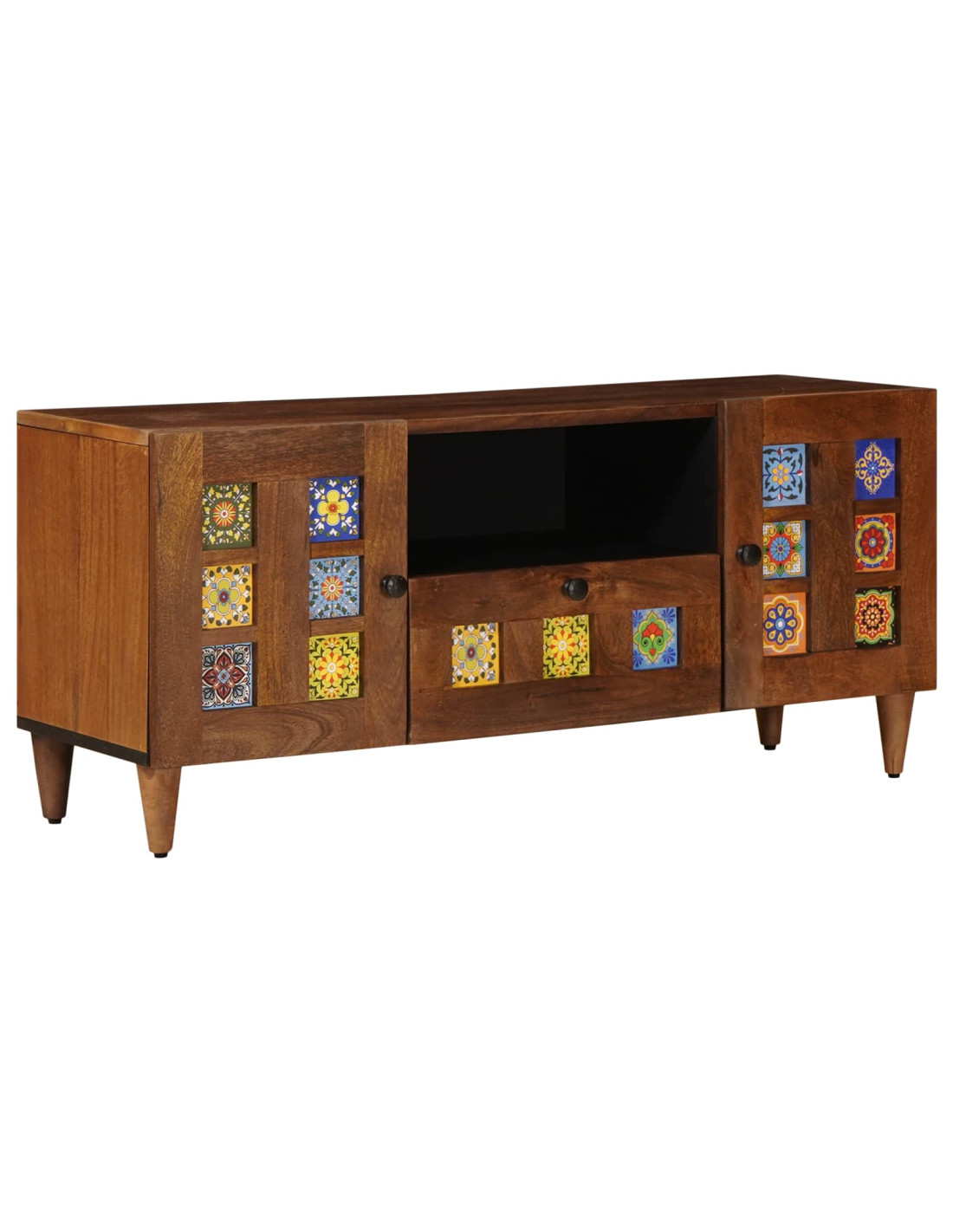 - Materiali di qualità: Fatto in legno di mango solido, questo mobile TV è robusto e duraturo. La texture e la grana del legno di mango portano calore e un aspetto unico al tuo soggiorno, davvero apprezzato da chi ama il legno, mentre il legno ingegnerizzato secondario ne migliora la stabilità.