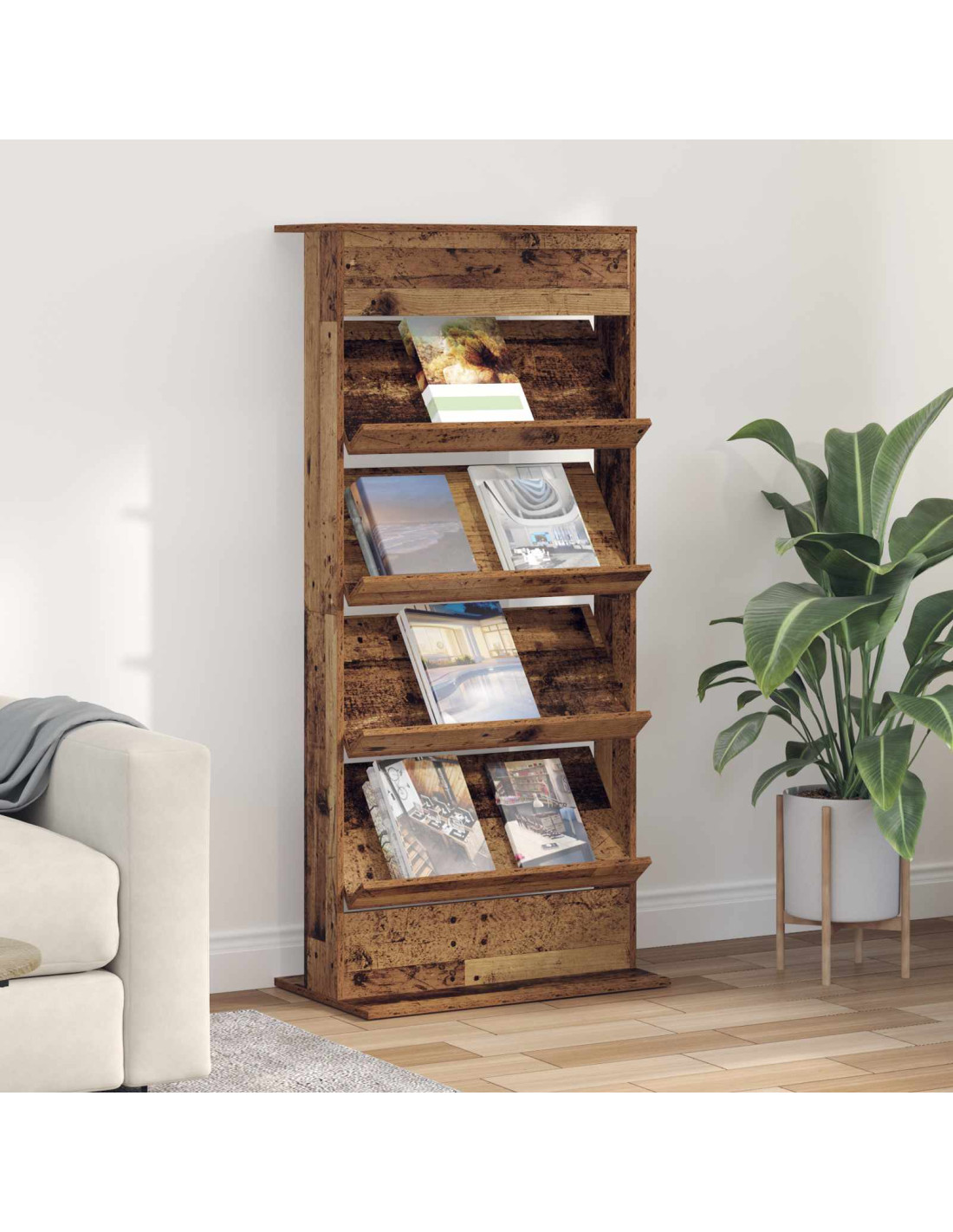 - Materiali: Questo porta riviste è fatto completamente di legno ingegnerizzato, con una superficie liscia che si abbina al design moderno. Scegliamo questo legno per la sua durabilità e la sua texture uniforme, così resiste all'uso quotidiano e porta eleganza a qualsiasi ambiente. È leggero, quindi puoi spostarlo facilmente dove vuoi.
