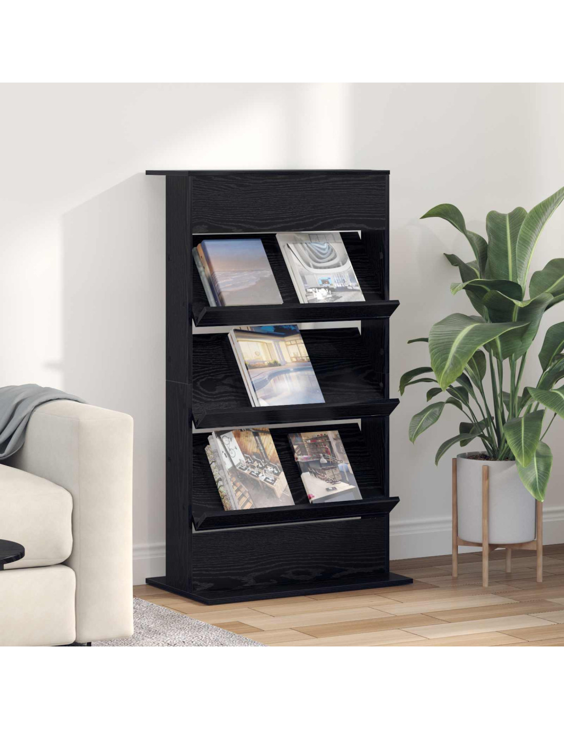 - Materiali: Questo porta riviste è fatto completamente di legno ingegnerizzato, con una superficie liscia che si abbina al design moderno. Scegliamo questo legno per la sua durabilità e la sua texture uniforme, così resiste all'uso quotidiano e porta eleganza a qualsiasi ambiente. È leggero, quindi puoi spostarlo facilmente dove vuoi.