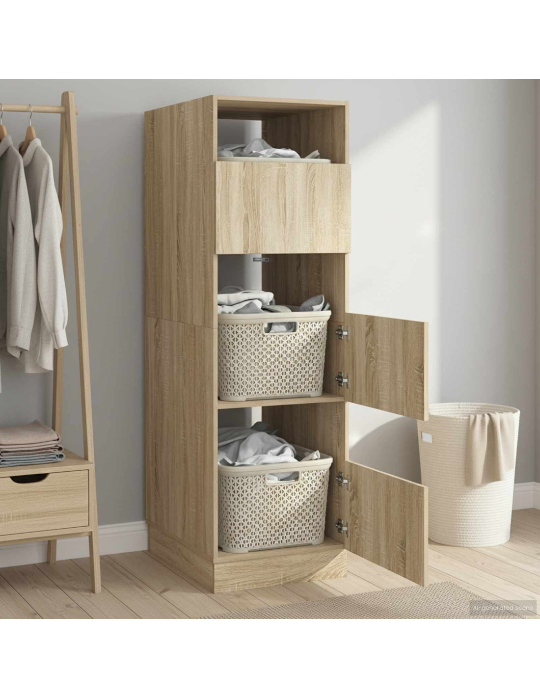 Questo armadietto per lavanderia è il mix perfetto di stile e funzionalità. Disegnato per arricchire qualsiasi bagno, ha un aspetto elegante con una superficie liscia e un design moderno. Realizzato in legno ingegnerizzato, è sia bello che resistente, rendendolo una scelta top per chi cerca ordine e stile. Ha spazio a sufficienza per tenere tutto in ordine.