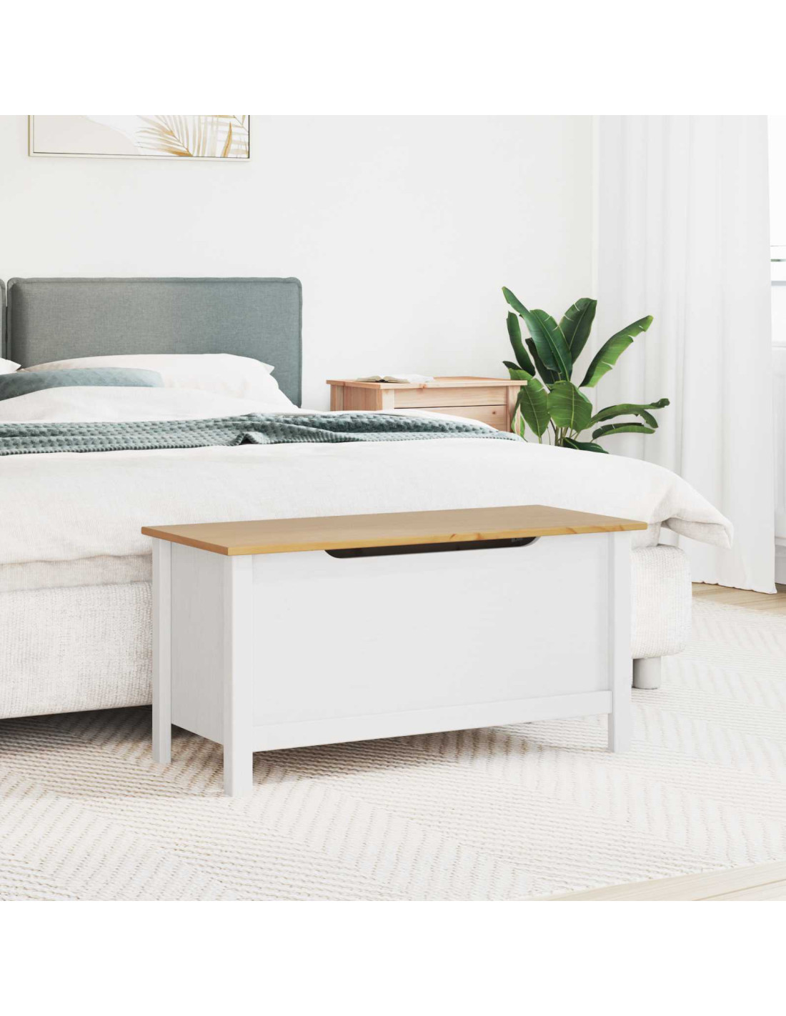 La scatola di stoccaggio moderna è la soluzione perfetta per chi cerca qualcosa di pratico e bello per i propri spazi. Con un design minimalista, si integra facilmente in qualsiasi stanza, ideale per camere da letto e soggiorni. Il legno massello di pino è caldo e accogliente e si adatta vari stili di arredamento. La forma rettangolare la rende compatta ma comunque spaziosa, perfetta per tanti usi in casa.