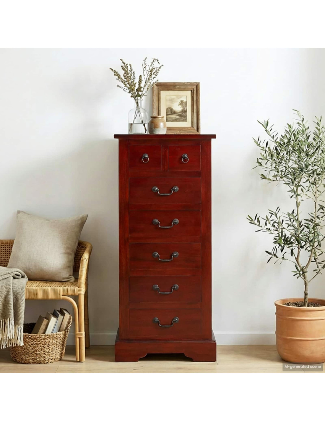 - Costruzione in legno massello di mogano: Questo cassettone è fatto con legno massello di mogano, noto per bellezza e resistenza. I suoi toni ricchi e la rifinitura elegante portano un tocco di lusso a qualsiasi stanza, e la sua durezza lo rende resistente all'uso quotidiano.