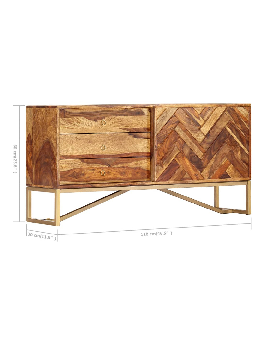 Questo armadietto laterale è realizzato in legno massello di acacia. Lo acacia, noto anche come palissandro o dalbergia, è un legno duro tropicale famoso per le sue ricche venature. La squisita fattura e le bellissime venature del legno rendono ogni mobile unico e leggermente diverso dagli altri. Questa cassettiera ha un piano robusto su cui potete posizionare oggetti decorativi come cesti di frutta o vasi, mentre le sue resistenti gambe in ferro verniciato a polvere in ottone contribuiscono alla costruzione robusta. Inoltre, questo mobile laterale in legno è dotato di 3 cassetti e 1 anta, offrendo ampio spazio per tenere a portata di mano riviste, libri e vari altri piccoli oggetti.