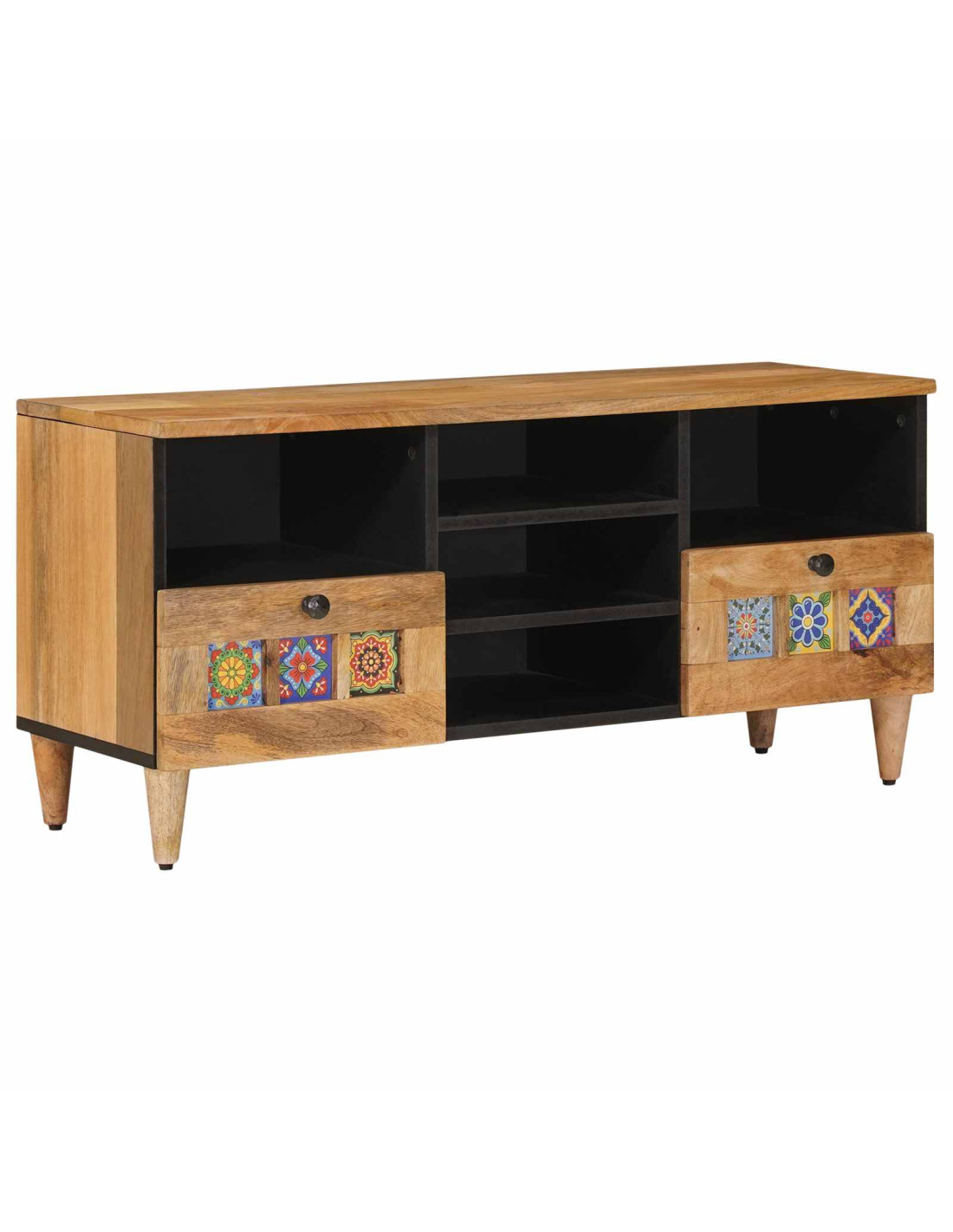 - Materiali: Questa credenza TV moderna è fatta con materiali di alta qualità che la rendono resistente e duratura. La struttura è in legno massello di mango, conosciuto per la sua forza e il suo design elegante, mentre ripiani e retro sono in legno ingegnerizzato e MDF, garantendo una combinazione di durata e facilità da pulire, per un uso quotidiano nel soggiorno.