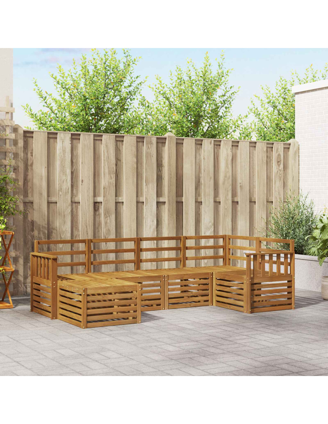 Questo set di divani per esterni combina eleganza moderna e funzionalità. Realizzato in legno massello di acacia, offre una seduta robusta e stabile, ideale per all'aperto. La sua forma rettangolare e la superficie a listelli mettono in risalto la naturalezza del legno. Con linee pulite e design minimalista, si integra bene in giardini e terrazze contemporary, invitandoti a rilassarti sotto il cielo.