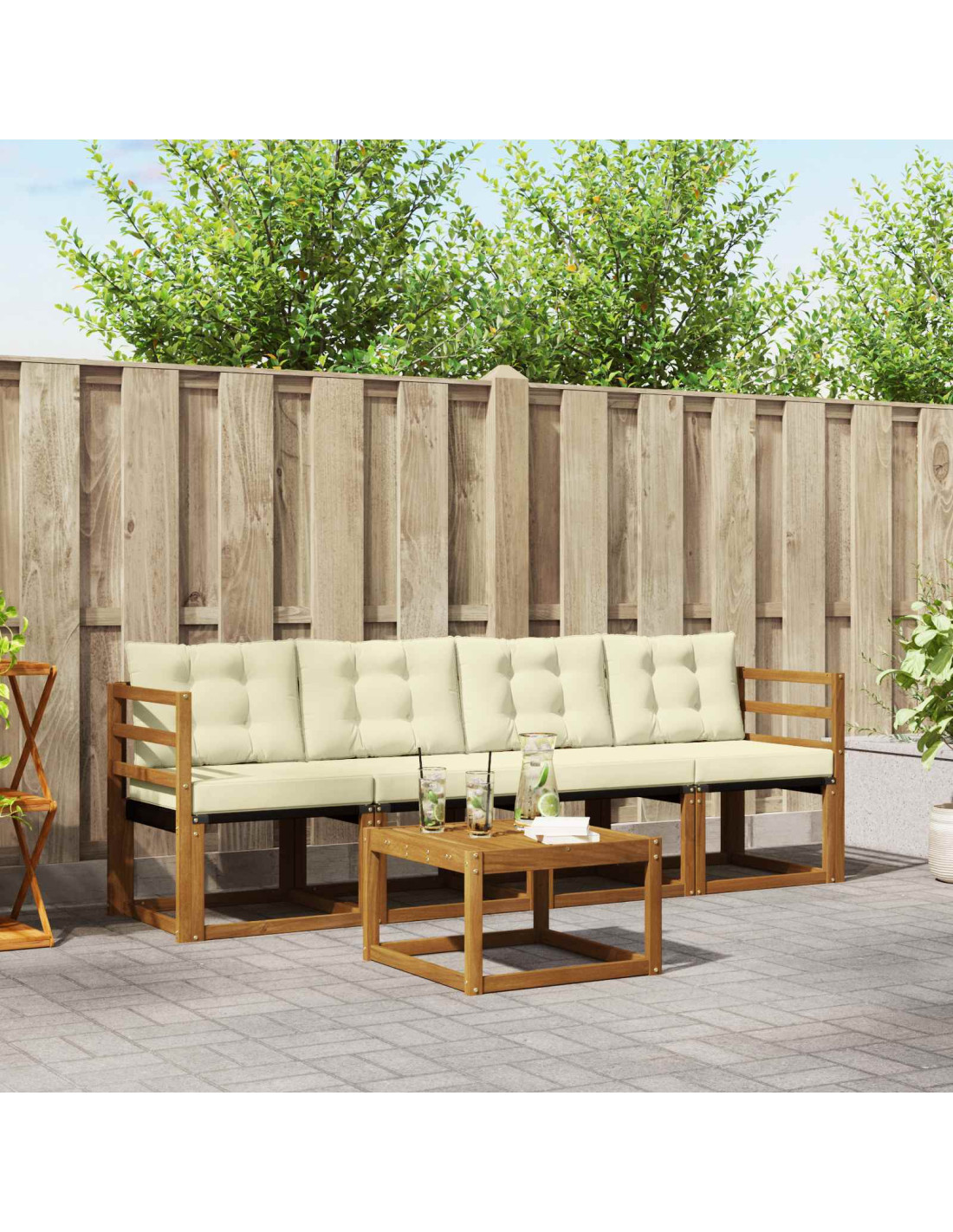 Il set di mobili da esterno unisce stile e funzionalità, diventando il punto focale di qualsiasi giardino o terrazzo. Con il suo design moderno caratterizzato da linee pulite e dettagli semplici, aggiunge un tocco di eleganza mentre favorisce il relax all'aperto e gli incontri tra amici. Interamente realizzato in legno massello di acacia, questo set è fatto per durare e ha un aspetto che non passa mai di moda, perfetto per chi cerca praticità e stile nei mobili da esterno.