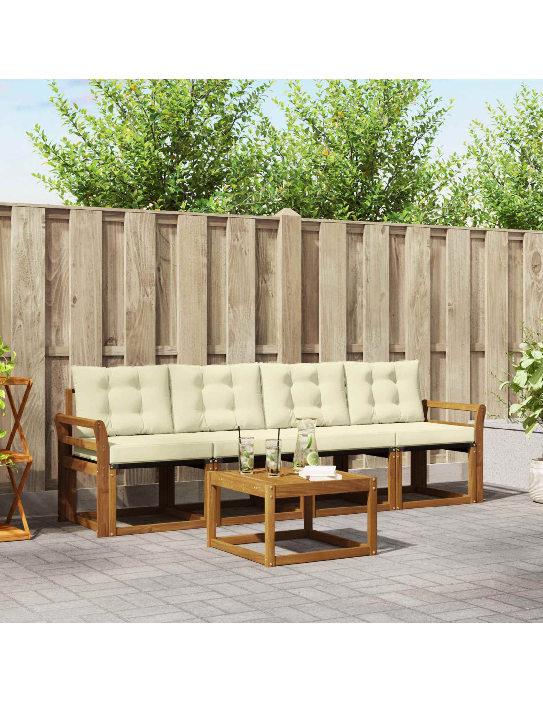 Il set di mobili da esterno unisce stile e funzionalità, diventando il punto focale di qualsiasi giardino o terrazzo. Con il suo design moderno caratterizzato da linee pulite e dettagli semplici, aggiunge un tocco di eleganza mentre favorisce il relax all'aperto e gli incontri tra amici. Interamente realizzato in legno massello di acacia, questo set è fatto per durare e ha un aspetto che non passa mai di moda, perfetto per chi cerca praticità e stile nei mobili da esterno.
