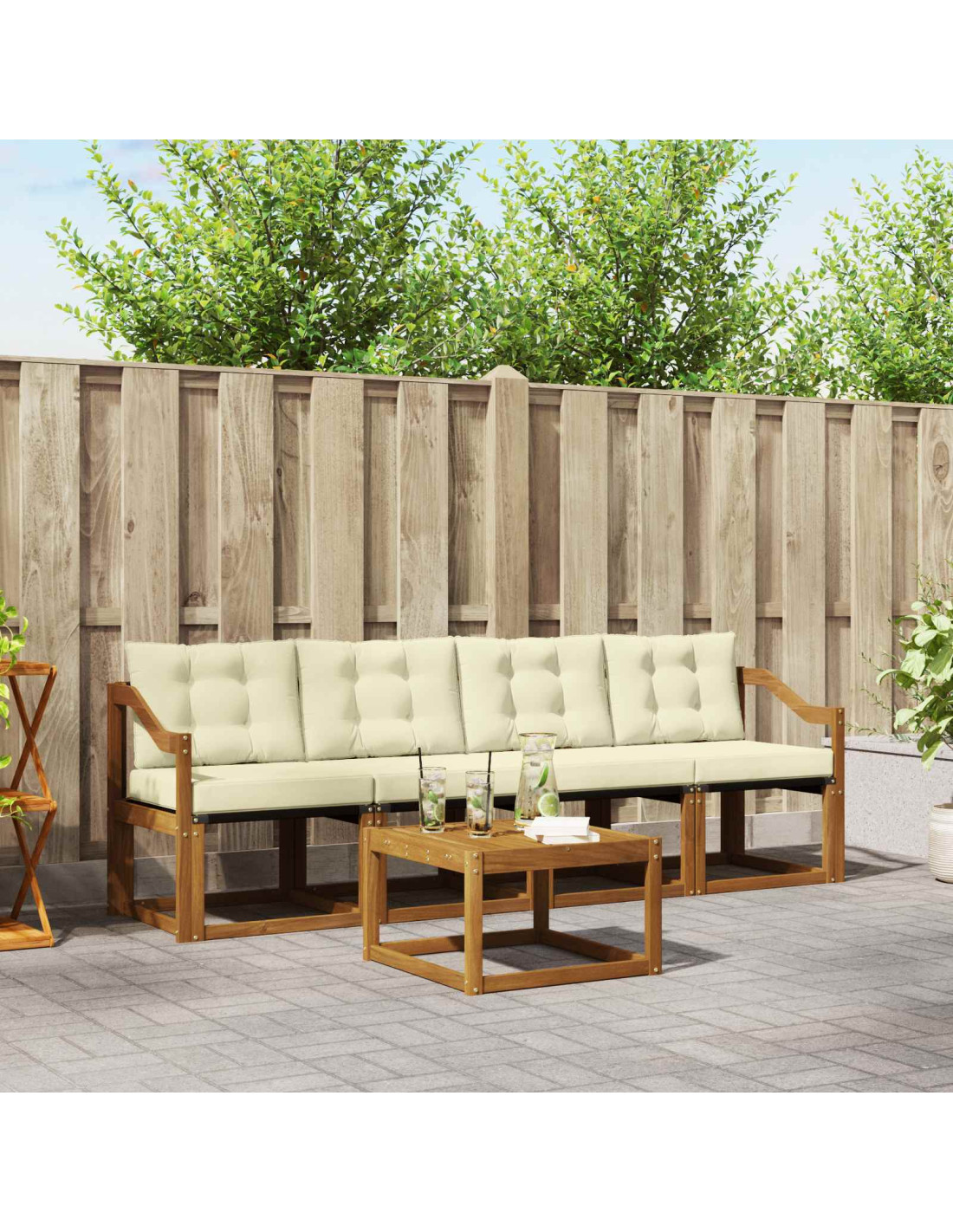 Il set di mobili da esterno unisce stile e funzionalità, diventando il punto focale di qualsiasi giardino o terrazzo. Con il suo design moderno caratterizzato da linee pulite e dettagli semplici, aggiunge un tocco di eleganza mentre favorisce il relax all'aperto e gli incontri tra amici. Interamente realizzato in legno massello di acacia, questo set è fatto per durare e ha un aspetto che non passa mai di moda, perfetto per chi cerca praticità e stile nei mobili da esterno.