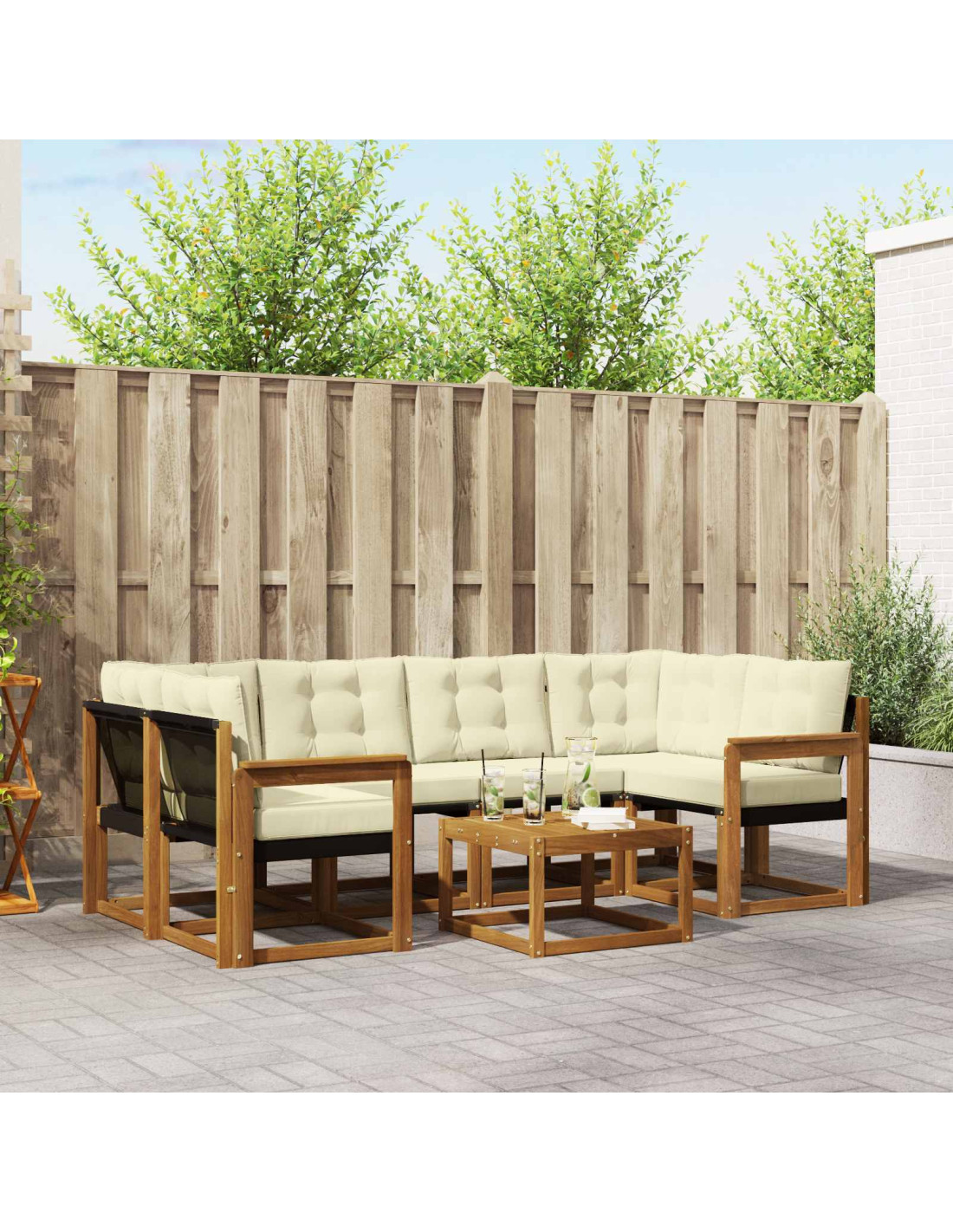 - Combinazione chic di materiali: Fatto con legno massello di acacia e Textilene, questo set divano ha una bella texture in legno naturale e una seduta resistente. I materiali offrono non solo un look moderno ma anche robustezza contro le intemperie, promettendo che sarà tuo amico in ogni stagione.