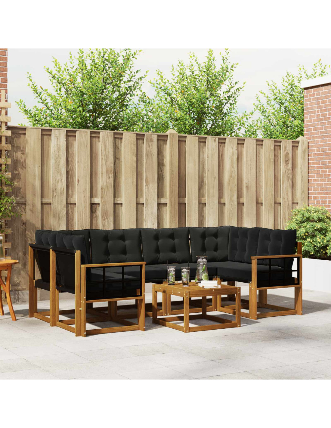 - Combinazione chic di materiali: Fatto con legno massello di acacia e Textilene, questo set divano ha una bella texture in legno naturale e una seduta resistente. I materiali offrono non solo un look moderno ma anche robustezza contro le intemperie, promettendo che sarà tuo amico in ogni stagione.