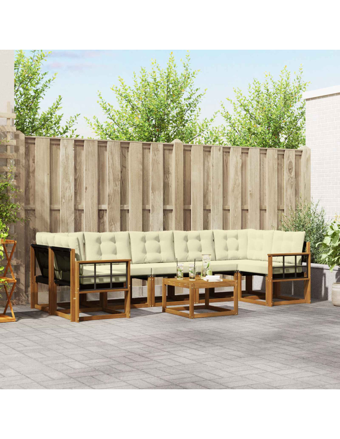 - Materiali: Il nostro set di divani è realizzato in legno massello di acacia, resistente all'umidità e progettato per durare nel tempo. Combinato con il texilene, offre una seduta comoda per ogni condizione atmosferica. Questa combinazione non solo garantisce durata, ma aggiunge anche eleganza al tuo spazio esterno.