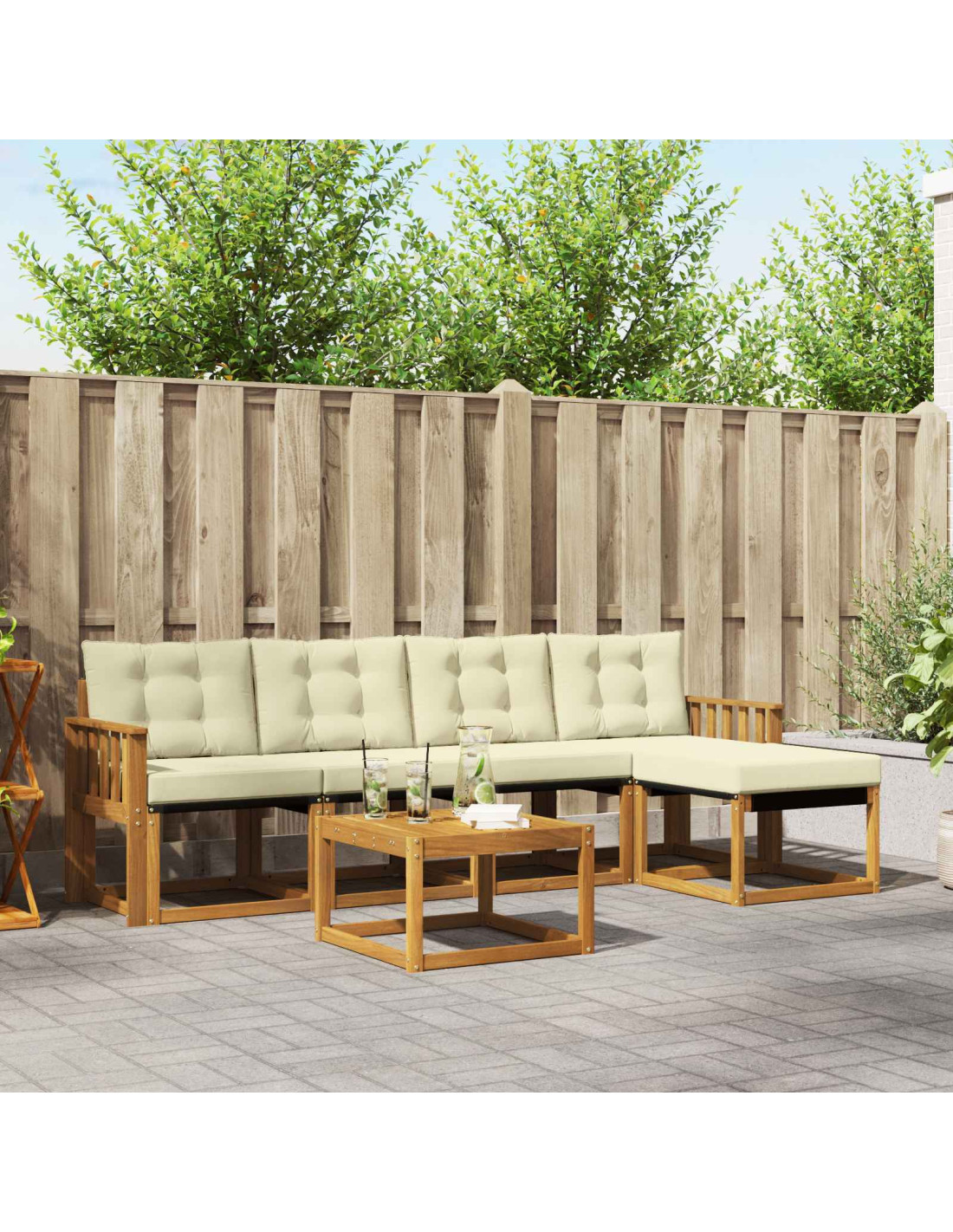Questo set di mobili per esterni unisce stile e praticità, creando un punto focale spettacolare in ogni giardino o terrazzo. Con un design moderno e linee pulite, aggiunge eleganza e favorisce il relax all'aperto e le riunioni tra amici. Totalmente realizzato in legno massello di acacia, è resistente e mantiene il suo fascino nel tempo, rendendolo la scelta perfetta per chi cerca praticità e design raffinato nei mobili da esterno.