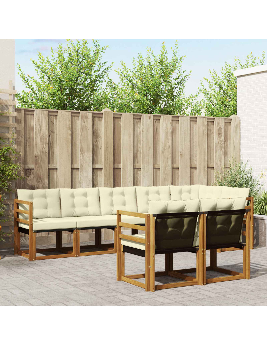 Il set di mobili da esterno combina stile e funzionalità, creando un'occasione perfetta per il tuo giardino o terrazza. Il design moderno, semplice e pulito, porta un tocco di eleganza, rendendolo ideale per momenti di relax o incontri all'aperto. Realizzato in legno massello di acacia, questo set è resistente e presenta un aspetto che dura nel tempo, rendendolo perfetto per chi cerca qualità nei mobili da esterno.