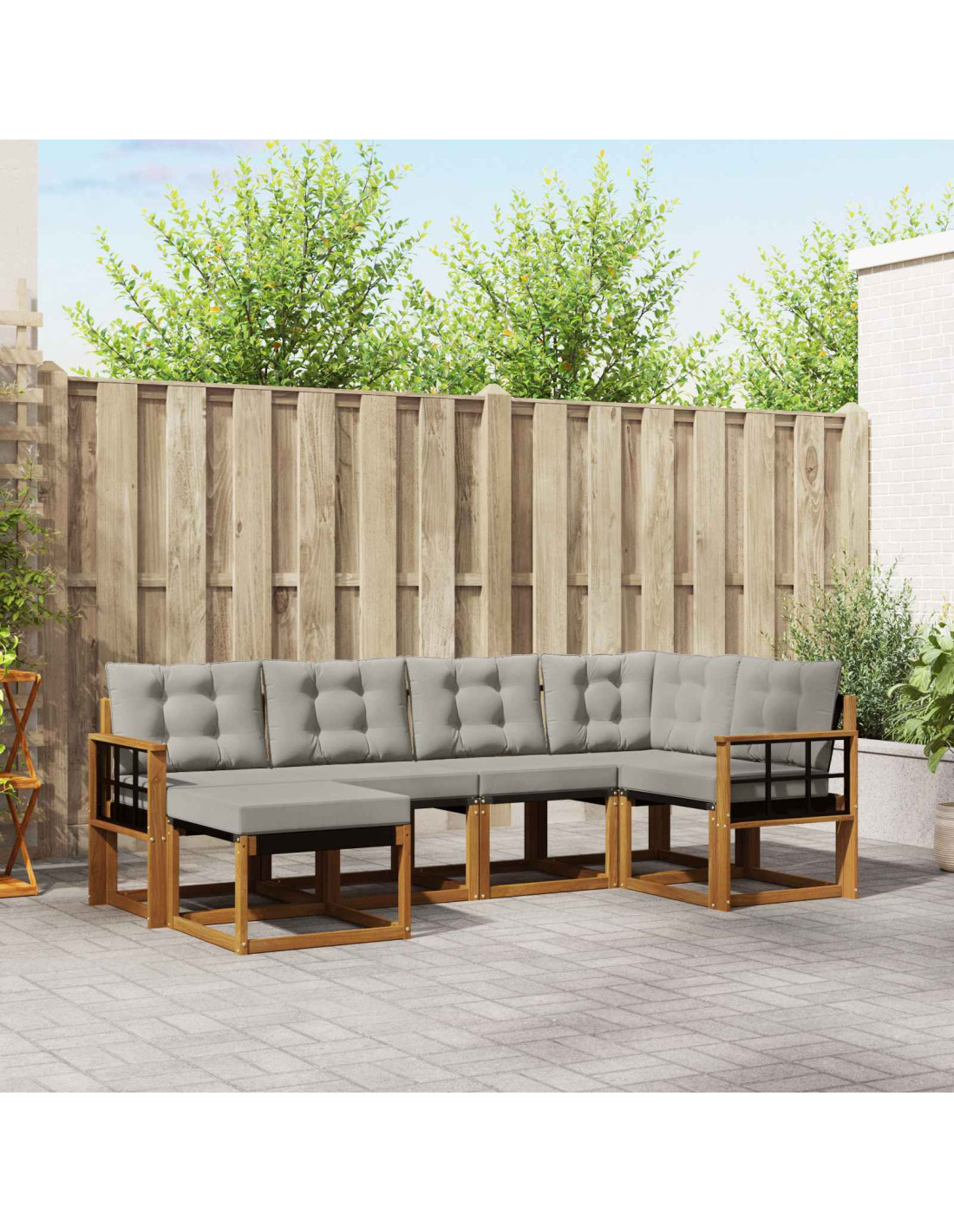- Struttura in legno massello di acacia: La base di questo set divano è realizzata in legno massello di acacia, noto per la sua resistenza e la bella venatura. Questo legno promette lunghe prestazioni e si integra bene con l'ambiente esterno, offrendo eleganza e robustezza, perfetto per ogni condizione climatica.