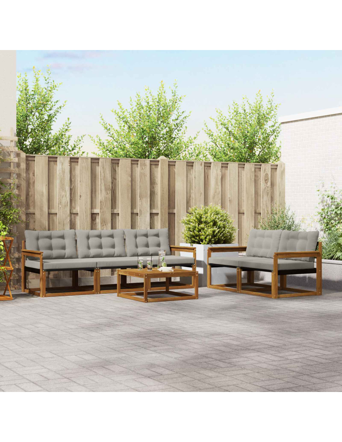 Il set di mobili da esterno unisce stile e funzionalità, diventando il punto focale di qualsiasi giardino o terrazza. Con il suo design moderno, linee pulite e dettagli semplici, aggiunge un tocco elegante mentre invita al relax e ai momenti in compagnia. Realizzato in legno massello di acacia, è robusto e bello, perfetto per chi cerca un mix di praticità e raffinatezza nei mobili esterni.