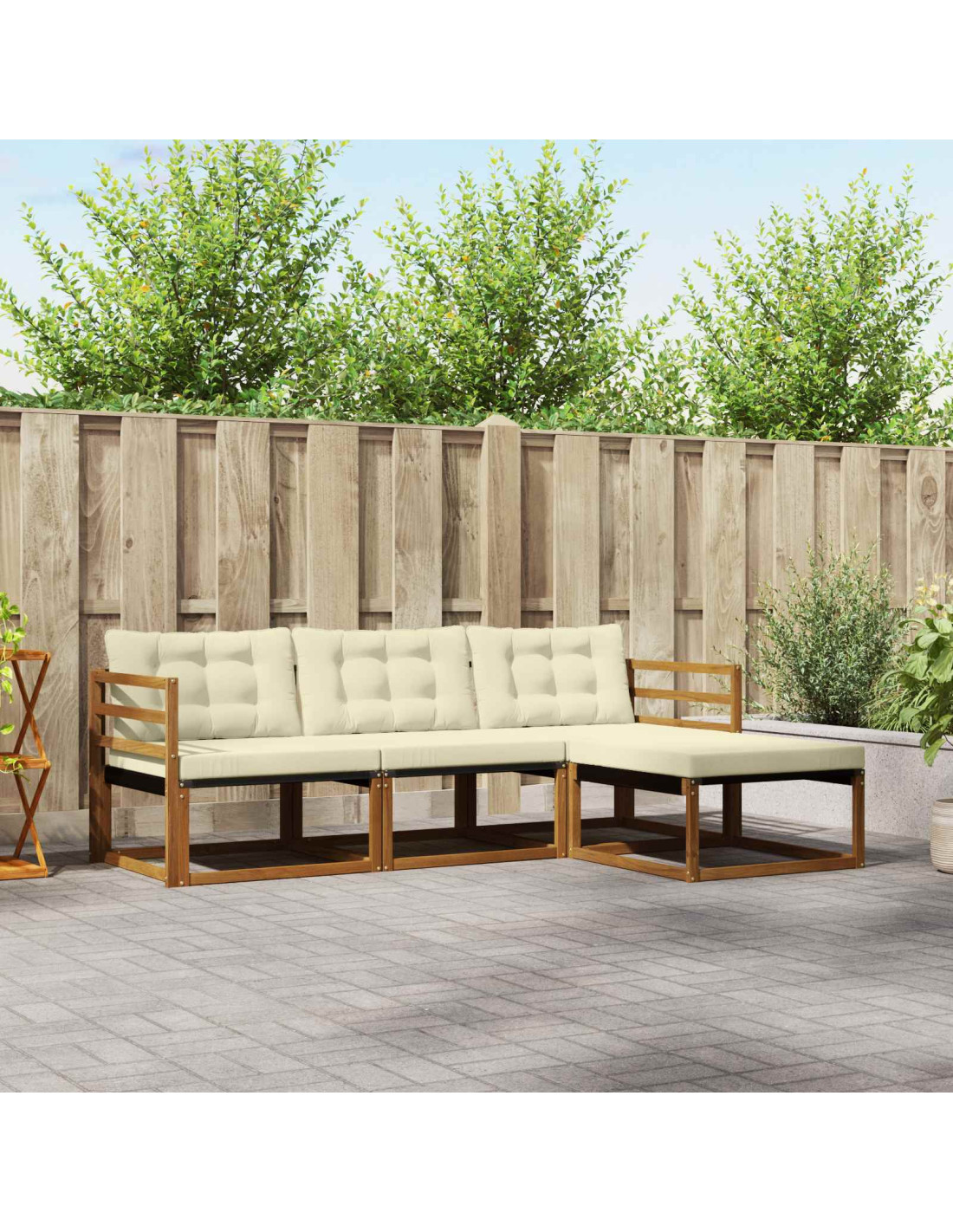 Il set di mobili da esterno unisce stile e praticità, creando un punto focale incredibile per ogni giardino o terrazza. Il suo design moderno, con linee semplici e dettagli minimi, offre eleganza e funge da supporto per il relax all’aperto e le riunioni tra amici. Realizzato in legno massello di acacia, il set assicura resistenza e un look duraturo, rendendolo ideale per chi cerca praticità e un design chic per i mobili outdoor.