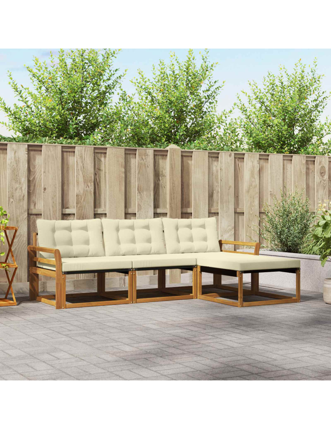 Il set di mobili da esterno unisce stile e praticità, creando un punto focale incredibile per ogni giardino o terrazza. Il suo design moderno, con linee semplici e dettagli minimi, offre eleganza e funge da supporto per il relax all’aperto e le riunioni tra amici. Realizzato in legno massello di acacia, il set assicura resistenza e un look duraturo, rendendolo ideale per chi cerca praticità e un design chic per i mobili outdoor.