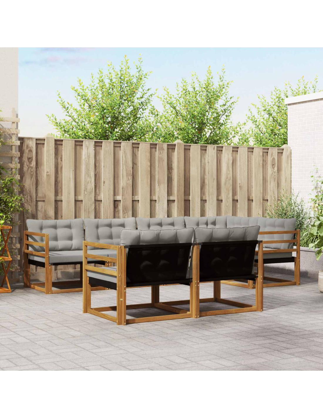 Questo set di mobili per esterni unisce stile e funzionalità, diventando il punto focale del tuo giardino o terrazza. Il design moderno, con linee pulite e dettagli minimali, aggiunge un tocco di eleganza e supporta il tuo relax all'aperto e le riunioni con gli amici. Realizzato interamente in legno massello di acacia, ti offre resistenza e bellezza, rendendolo perfetto per chi cerca praticità senza rinunciare al design.