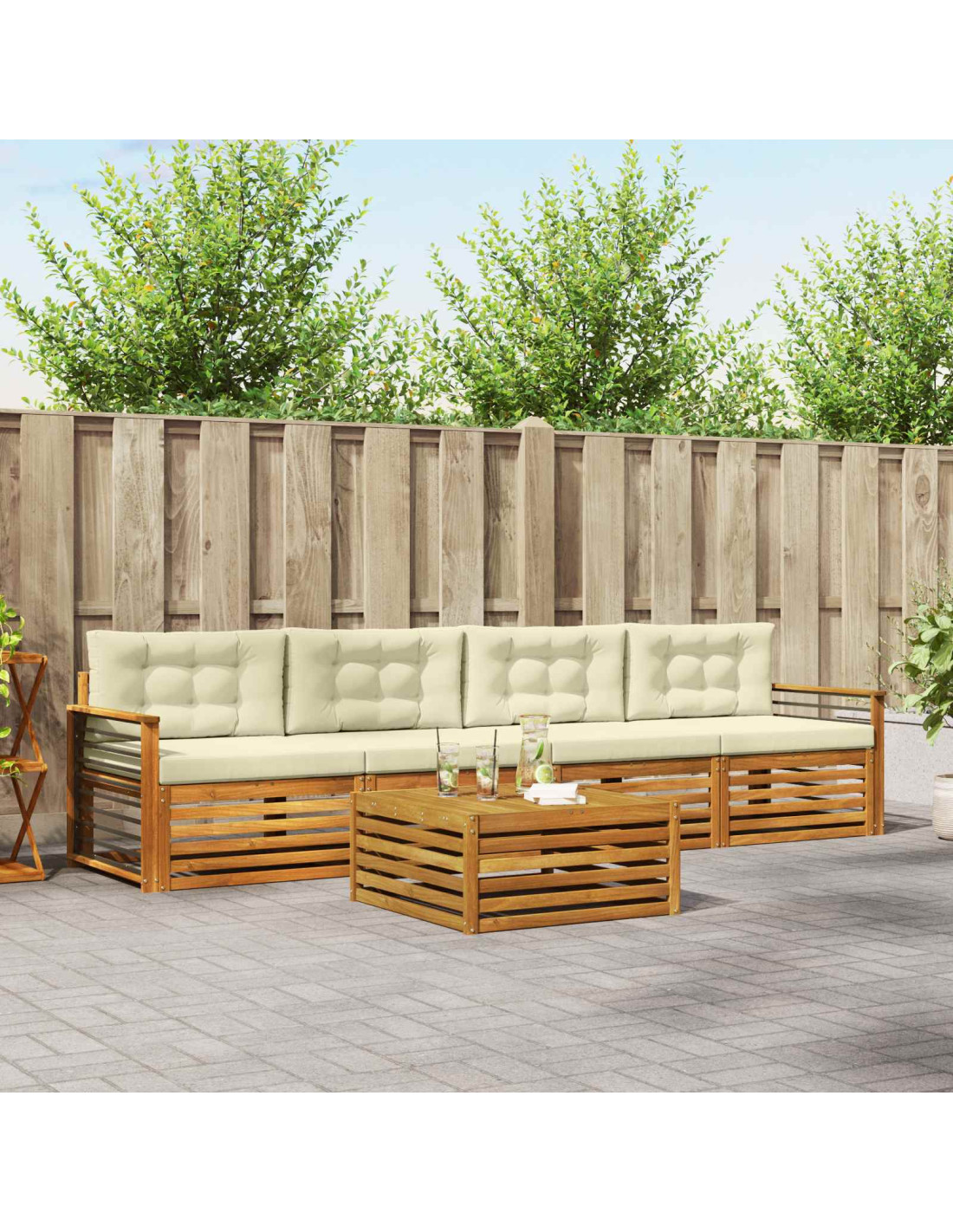 Il set di mobili da esterno unisce stile e funzionalità, creando un colpo d'occhio per qualsiasi giardino o terrazza. Il design moderno con linee pulite e dettagli semplici aggiunge eleganza e supporta il relax all'aperto e le riunioni sociali. Interamente in legno massello di acacia, questo set è resistente e mantiene il suo aspetto nel tempo, ideale per chi cerca praticità e un design raffinato.