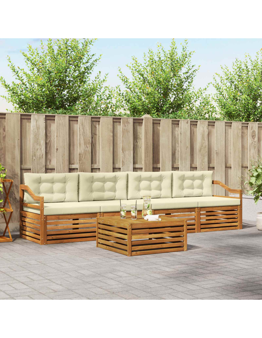 Il set di mobili da esterno unisce stile e funzionalità, creando un colpo d'occhio per qualsiasi giardino o terrazza. Il design moderno con linee pulite e dettagli semplici aggiunge eleganza e supporta il relax all'aperto e le riunioni sociali. Interamente in legno massello di acacia, questo set è resistente e mantiene il suo aspetto nel tempo, ideale per chi cerca praticità e un design raffinato.