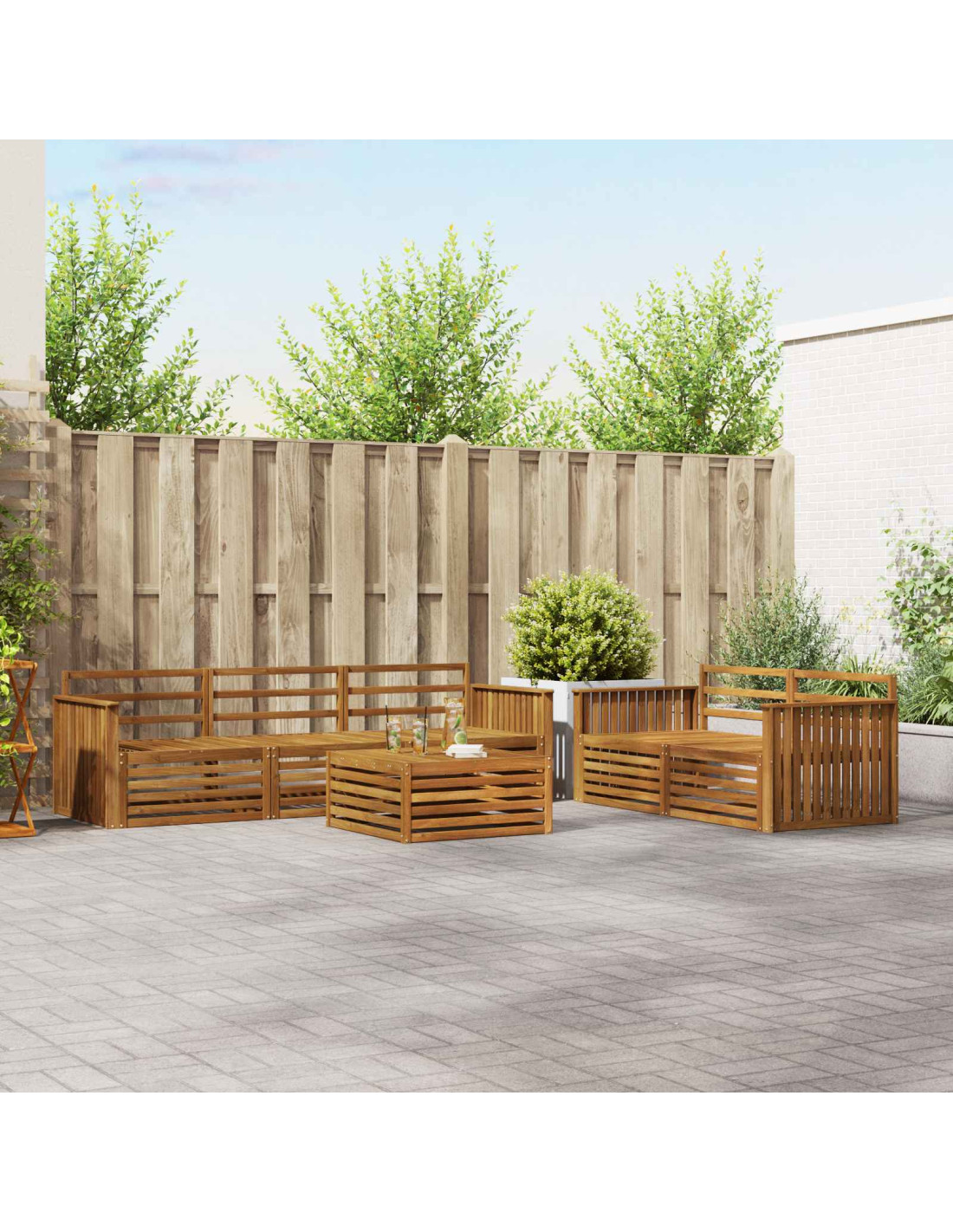 Questo set di mobili da esterno unisce stile e funzionalità, diventando il pezzo forte di qualsiasi giardino o terrazza. Con un design moderno caratterizzato da linee pulite e dettagli semplici, aggiunge eleganza e favorisce il relax all'aperto e le riunioni sociali. Realizzato in legno massello di acacia, è resistente e mantiene un aspetto attraente, perfetto per chi cerca praticità senza rinunciare al design.
