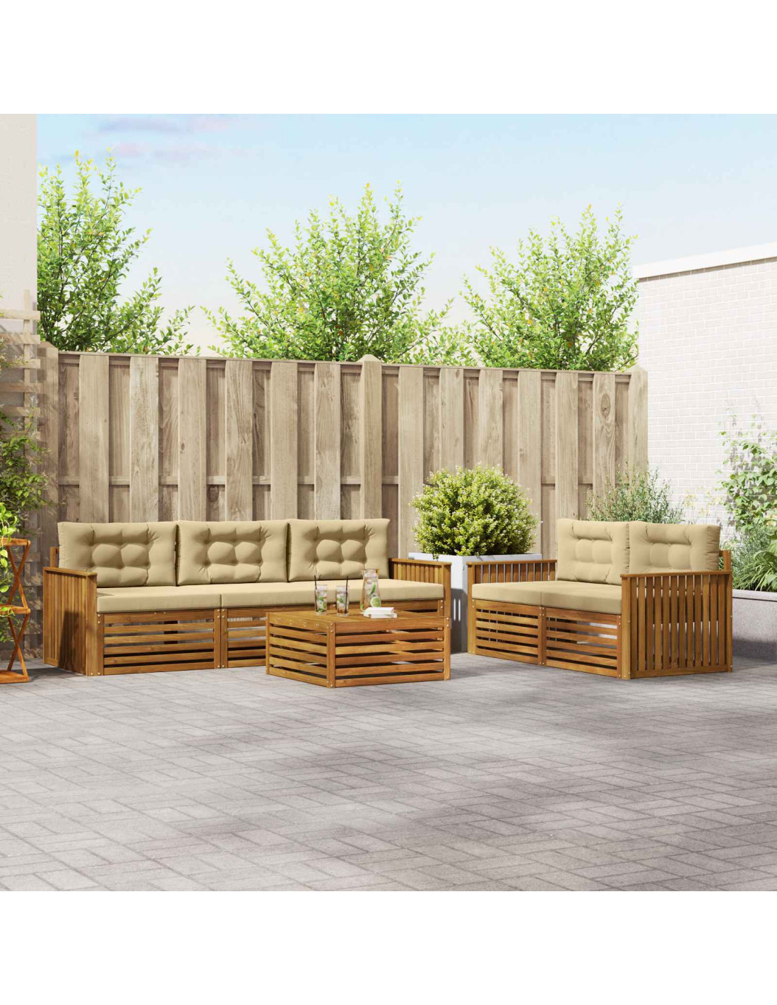 Questo set di mobili da esterno unisce stile e funzionalità, diventando il pezzo forte di qualsiasi giardino o terrazza. Con un design moderno caratterizzato da linee pulite e dettagli semplici, aggiunge eleganza e favorisce il relax all'aperto e le riunioni sociali. Realizzato in legno massello di acacia, è resistente e mantiene un aspetto attraente, perfetto per chi cerca praticità senza rinunciare al design.