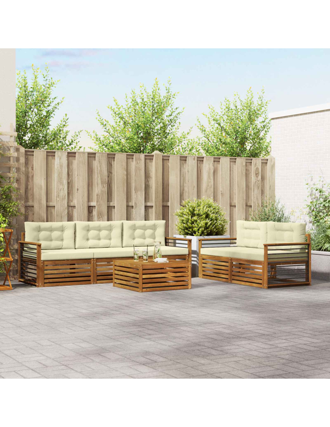 Questo set di mobili da esterno unisce stile e funzionalità, diventando il pezzo forte di qualsiasi giardino o terrazza. Con un design moderno caratterizzato da linee pulite e dettagli semplici, aggiunge eleganza e favorisce il relax all'aperto e le riunioni sociali. Realizzato in legno massello di acacia, è resistente e mantiene un aspetto attraente, perfetto per chi cerca praticità senza rinunciare al design.