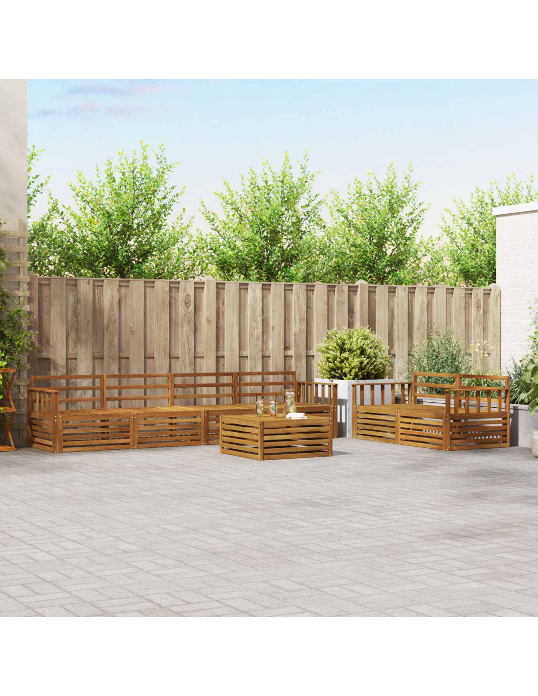 Il set di mobili da esterno unisce stile e praticità, creando un angolo fantastico per qualsiasi giardino o terrazza. Il suo design moderno, caratterizzato da linee pulite e dettagli minimalisti, aggiunge un tocco di eleganza mentre favorisce il relax e le riunioni all'aperto. Realizzato in legno massello di Acacia, è super resistente e ha un aspetto che dura nel tempo, quindi è perfetto per chi cerca sia funzionalità che bellezza nei mobili da esterno.