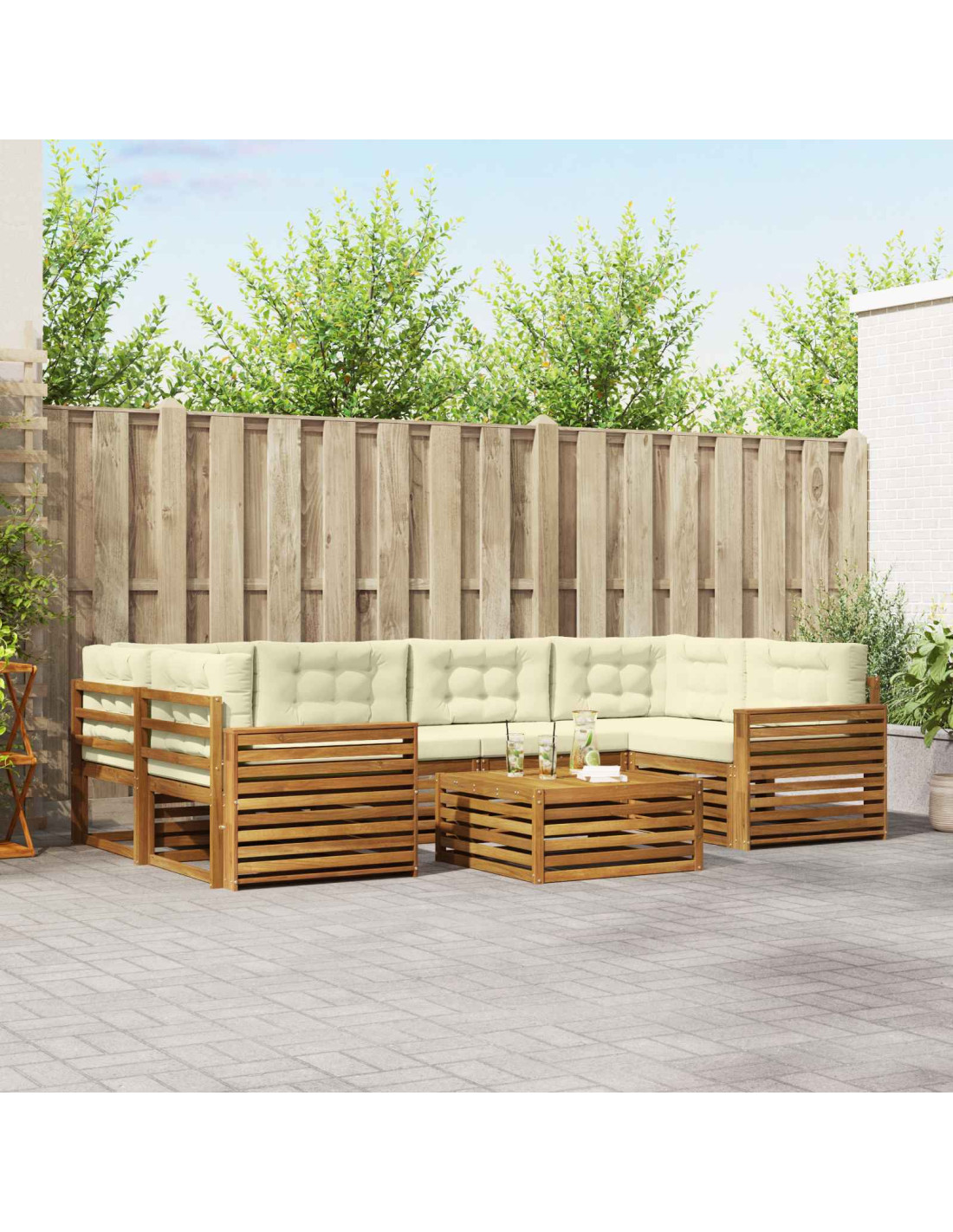 Il set di mobili da esterno unisce stile e funzionalità, diventando un punto focale per qualsiasi giardino o terrazza. Il design moderno, con linee pulite e dettagli minimi, aggiunge un tocco di eleganza e favorisce il relax all'aperto e le riunioni sociali. Fatto di legno massello di acacia, offre resistenza e un aspetto duraturo, rendendolo perfetto per chi cerca praticità e un design raffinato nei mobili per esterni.