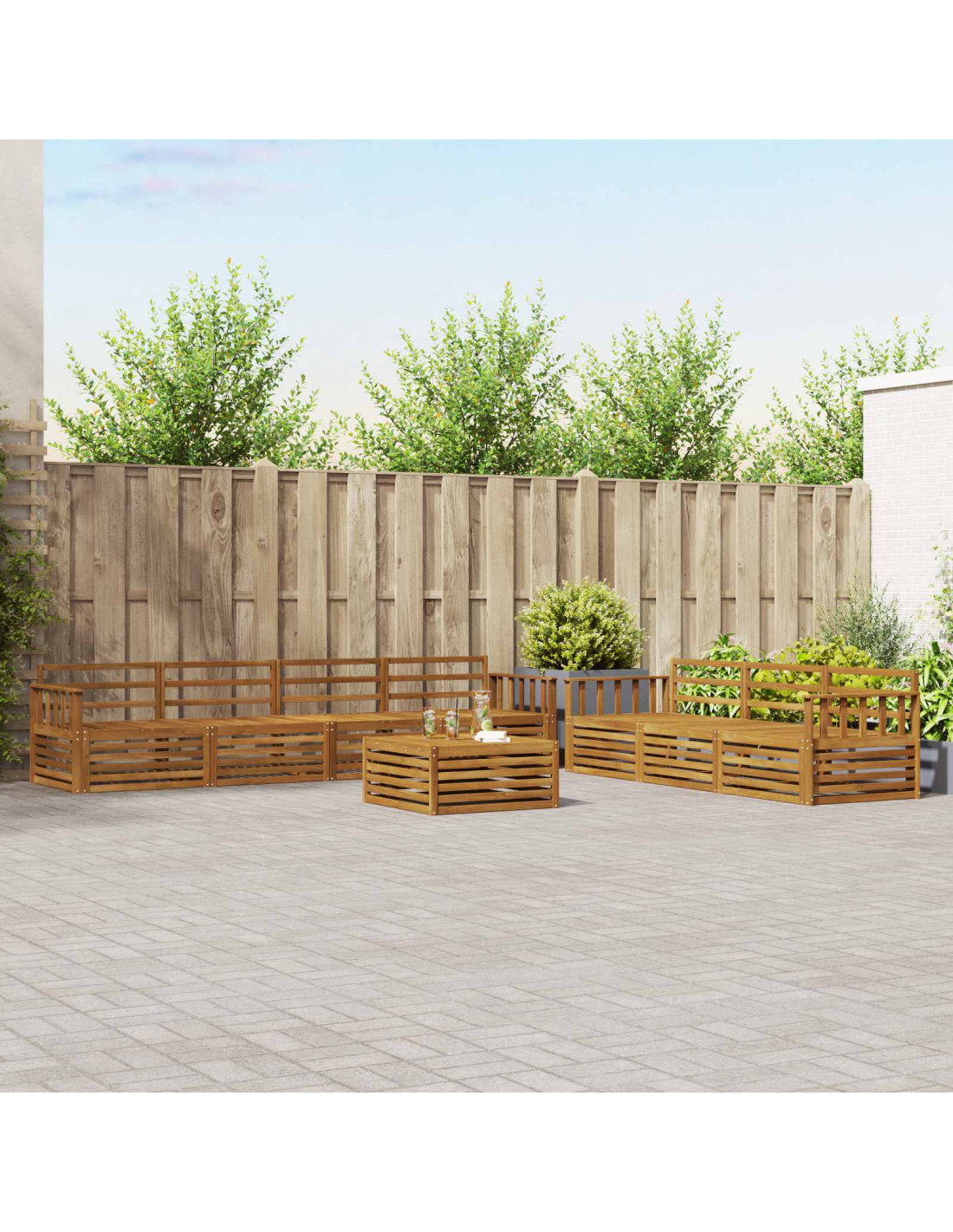 Il set di mobili da esterno è un mix perfetto di stile e praticità, creando un punto d'attrazione per ogni giardino o terrazza. Con il suo design moderno, fatto di linee pulite e dettagli minimal, aggiunge un tocco di eleganza, rendendolo ideale per rilassarsi all'aperto e per incontri sociali. Realizzato in legno massello di acacia, è robusto e visivamente gradevole, perfetto per chi cerca funzionalità e bellezza nei mobili da esterno.