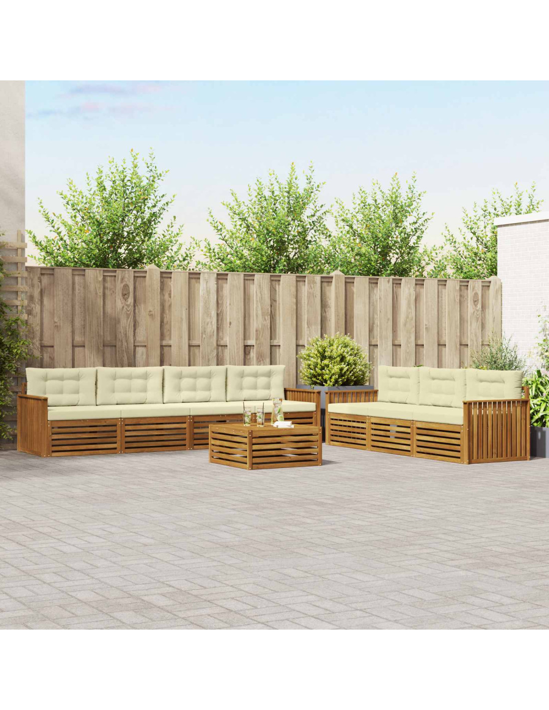 Il set di mobili da esterno è un mix perfetto di stile e praticità, creando un punto d'attrazione per ogni giardino o terrazza. Con il suo design moderno, fatto di linee pulite e dettagli minimal, aggiunge un tocco di eleganza, rendendolo ideale per rilassarsi all'aperto e per incontri sociali. Realizzato in legno massello di acacia, è robusto e visivamente gradevole, perfetto per chi cerca funzionalità e bellezza nei mobili da esterno.