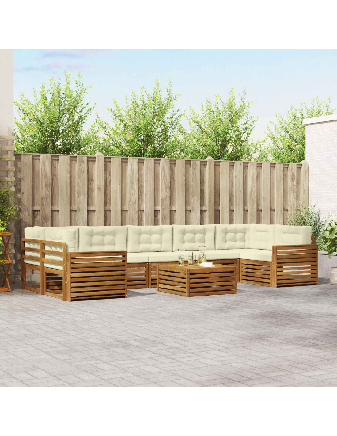 Il set di mobili da esterno è una combinazione perfetta di stile e funzionalità, un vero colpo d'occhio per giardini e terrazze. Il design moderno, con linee pulite e dettagli minimali, aggiunge un tocco di eleganza e crea l'ambiente ideale per il relax e le serate in compagnia. È realizzato in legno massello di acacia, che garantisce durata e un aspetto bellissimo, perfetto per chi cerca praticità e design raffinato nei mobili da esterno.