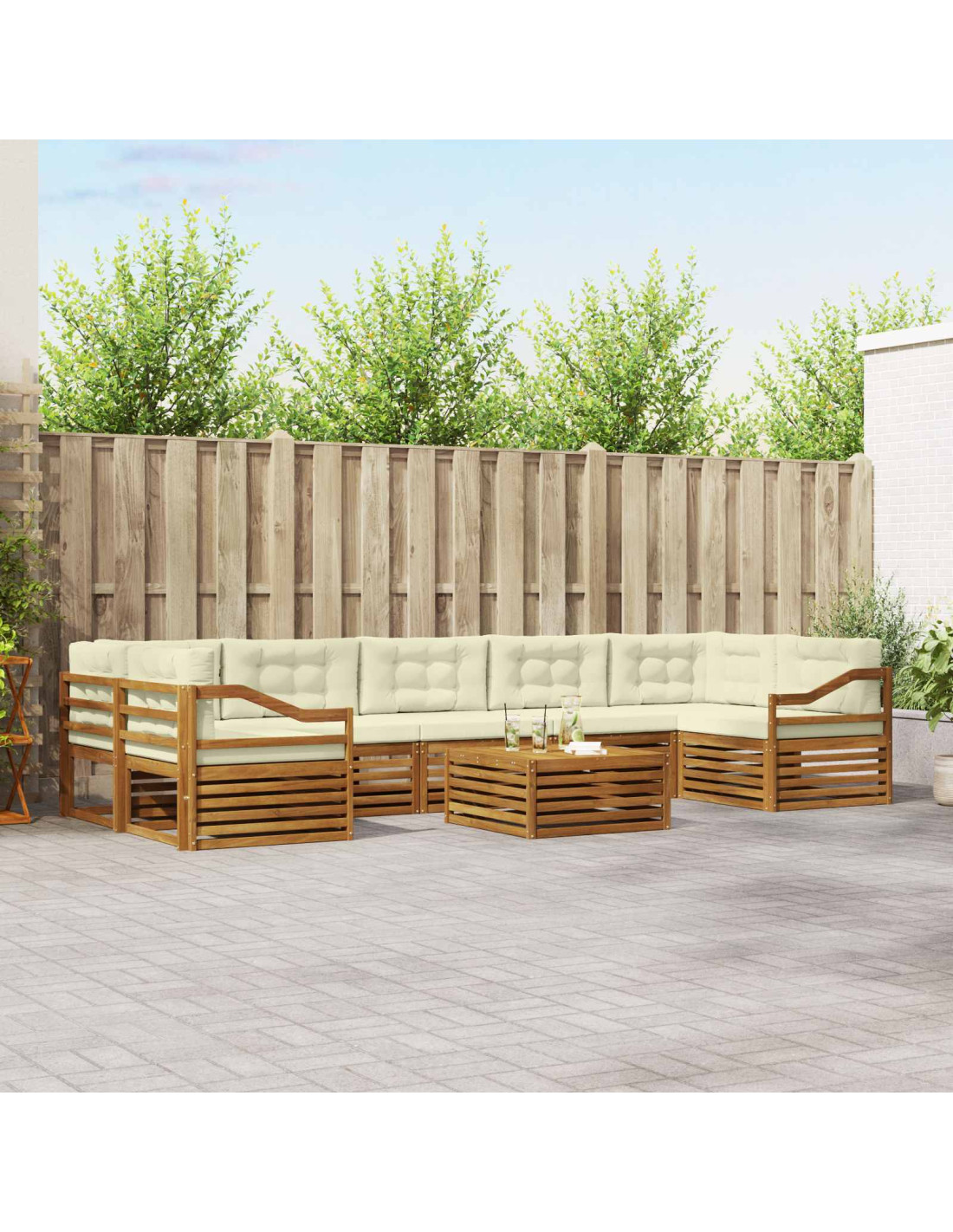 Il set di mobili da esterno è una combinazione perfetta di stile e funzionalità, un vero colpo d'occhio per giardini e terrazze. Il design moderno, con linee pulite e dettagli minimali, aggiunge un tocco di eleganza e crea l'ambiente ideale per il relax e le serate in compagnia. È realizzato in legno massello di acacia, che garantisce durata e un aspetto bellissimo, perfetto per chi cerca praticità e design raffinato nei mobili da esterno.