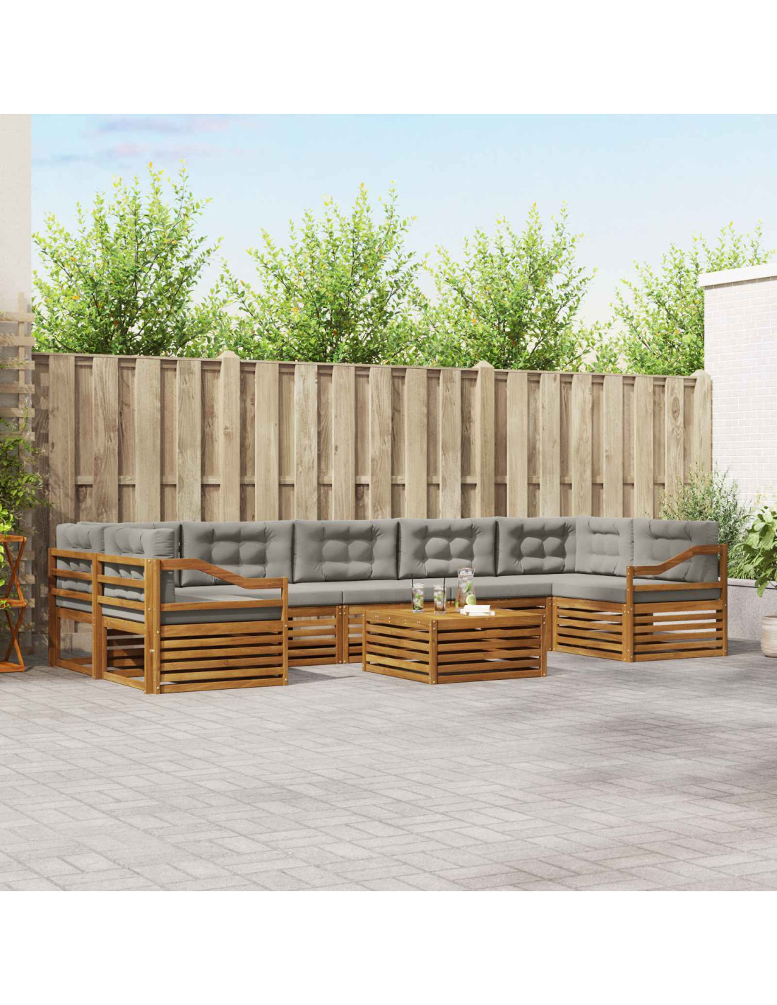 Il set di mobili da esterno è una combinazione perfetta di stile e funzionalità, un vero colpo d'occhio per giardini e terrazze. Il design moderno, con linee pulite e dettagli minimali, aggiunge un tocco di eleganza e crea l'ambiente ideale per il relax e le serate in compagnia. È realizzato in legno massello di acacia, che garantisce durata e un aspetto bellissimo, perfetto per chi cerca praticità e design raffinato nei mobili da esterno.