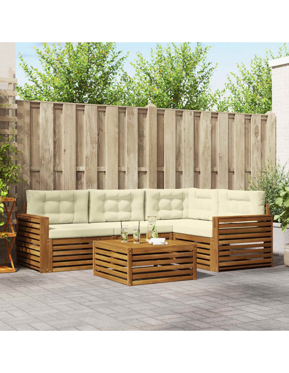 Questo set di mobili da esterno unisce stile e praticità, diventando il punto focale perfetto per il tuo giardino o terrazzo. Con un design moderno e linee pulite, aggiunge un tocco elegante mentre offre supporto per momenti di relax all'aperto e per socializzare con amici. È realizzato in legno massello di acacia, quindi è duraturo e sempre bello da vedere, ideale per chi cerca funzionalità e stile nei suoi mobile da esterno.