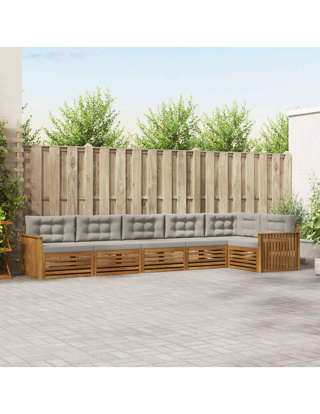 Il set di mobili da esterno unisce stile e praticità, diventando il fulcro perfetto per giardini e terrazze. Con un design moderno e linee pulite, aggiunge un tocco di eleganza mentre favorisce il relax all'aperto e i momenti sociali. Realizzato in legno massello di acacia, garantisce durabilità e un'estetica sempre attuale, rendendolo ideale per chi cerca funzionalità e bellezza nei mobili da esterno.