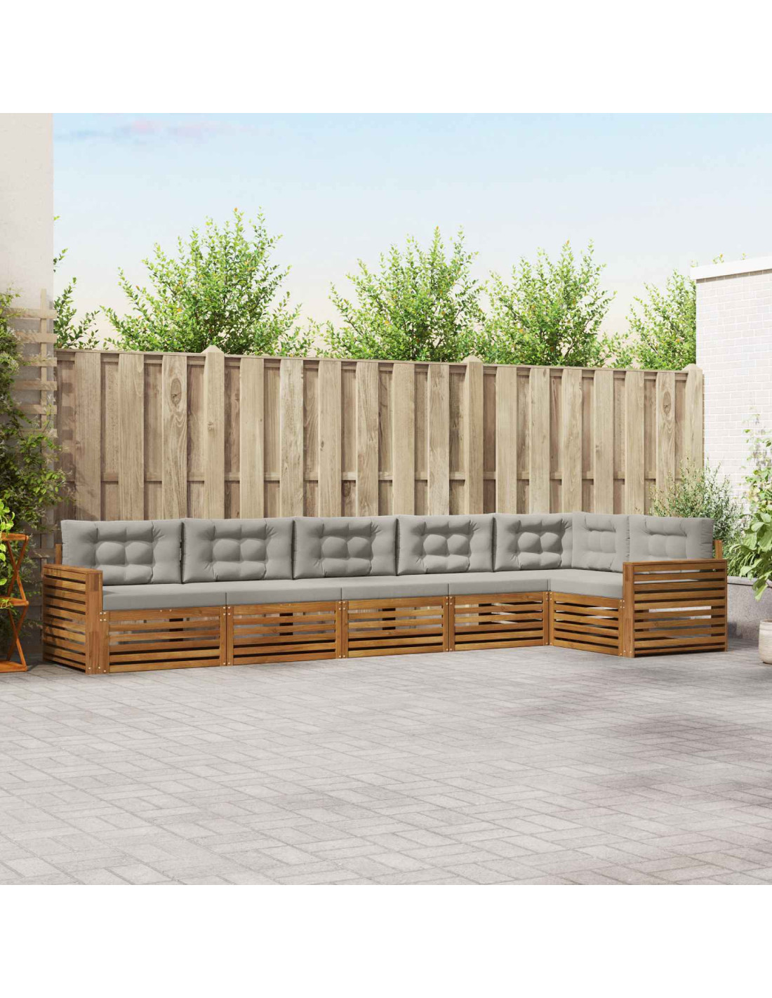Il set di mobili da esterno unisce stile e praticità, diventando il fulcro perfetto per giardini e terrazze. Con un design moderno e linee pulite, aggiunge un tocco di eleganza mentre favorisce il relax all'aperto e i momenti sociali. Realizzato in legno massello di acacia, garantisce durabilità e un'estetica sempre attuale, rendendolo ideale per chi cerca funzionalità e bellezza nei mobili da esterno.