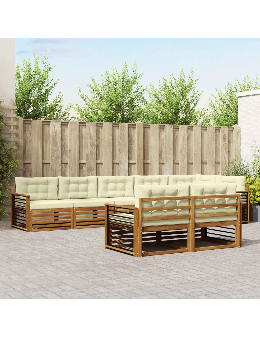 Questo set di divani da esterno unisce eleganza moderna e comfort pratico, con un design che si adatta a qualsiasi giardino o terrazza. L'estetica è semplice, con linee pulite e il calore del legno massello di acacia. Perfetto per stare all'aperto, combina durabilità e flessibilità, permettendo disposizioni creative adatte a svaghi, intrattenimenti o chiacchierate informali. Ogni pezzo non solo migliora l'atmosfera del tuo giardino, ma crea anche un’atmosfera accogliente per riunioni o serate tranquille da soli.