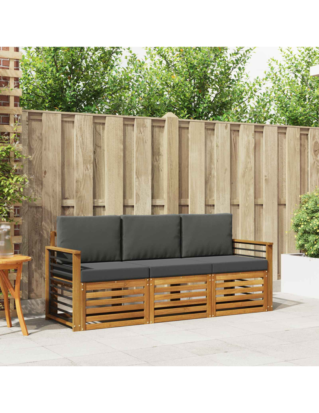 - Materiali: Questo set esterno è fatto in legno massello di acacia, con una texture naturale che si adatta a qualsiasi ambiente outdoor. Le tonalità calde del legno aggiungono carattere e rendono l'atmosfera più accogliente.