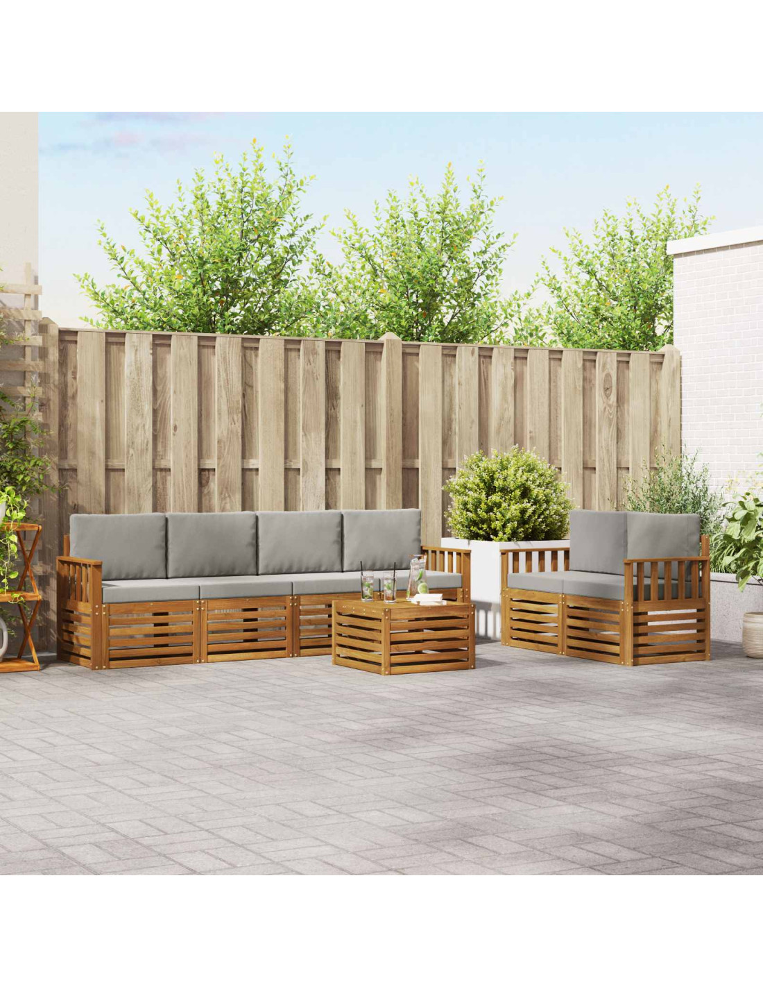 Il set di mobili da esterno unisce stile e funzionalità, diventando il pezzo forte di qualsiasi giardino o terrazza. Con un design moderno caratterizzato da linee pulite e dettagli minimalisti, aggiunge un tocco di eleganza e favorisce il relax all'aperto e l'incontro tra amici. Realizzato in legno massello di acacia, il set è resistente e ha un aspetto che dura nel tempo, ideale per chi cerca praticità ma anche un design raffinato per i mobili da esterno.